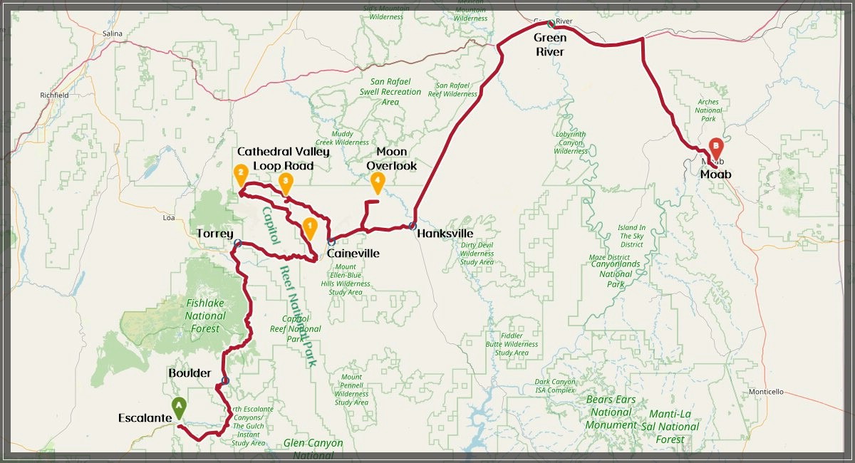 Nach insgesamt fuenf Stunden und 64 Meilen, also 103 Kilometern Traumkulisse sind wir wieder zurueck auf geteerten Strassen. Wie genau sieht die Runde denn nun eigentlich aus? Wir haben mal versucht, die Cathedral Valley Loop Road mit den Punkten, die wir angesehen haben auf eine Karte zu bringen: |