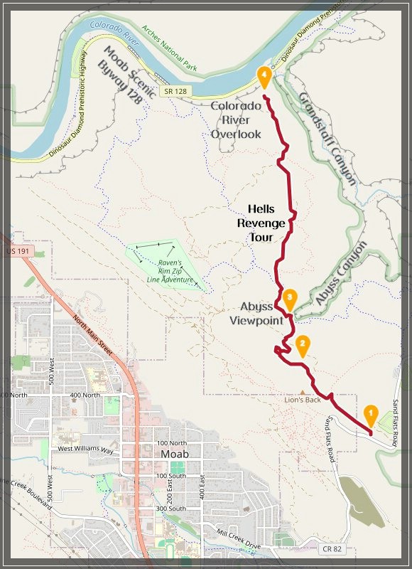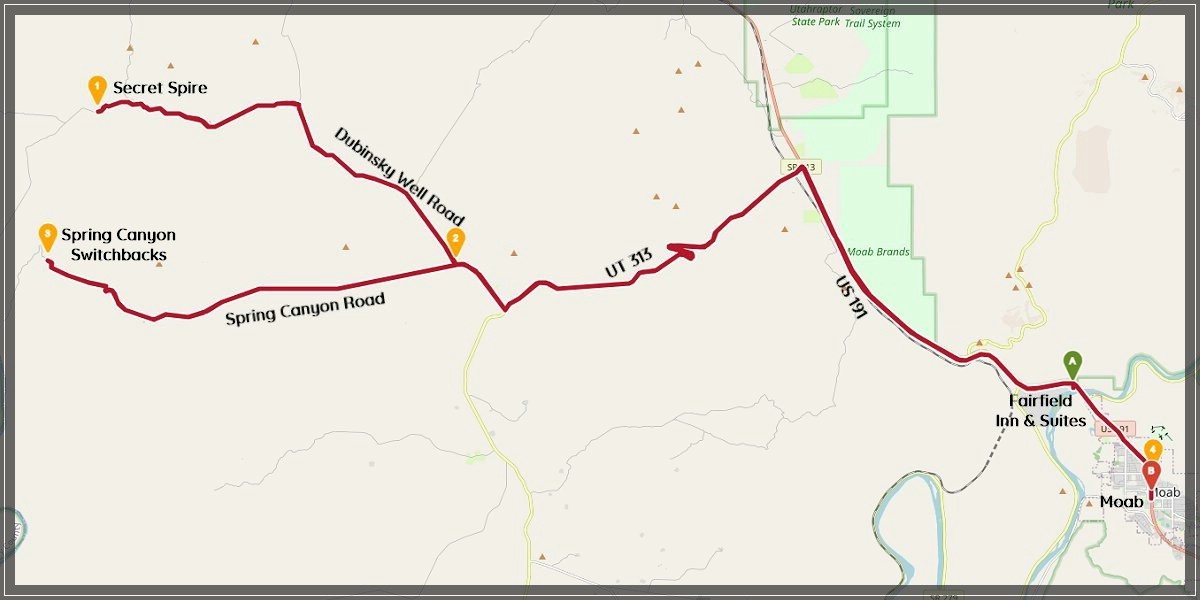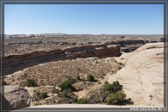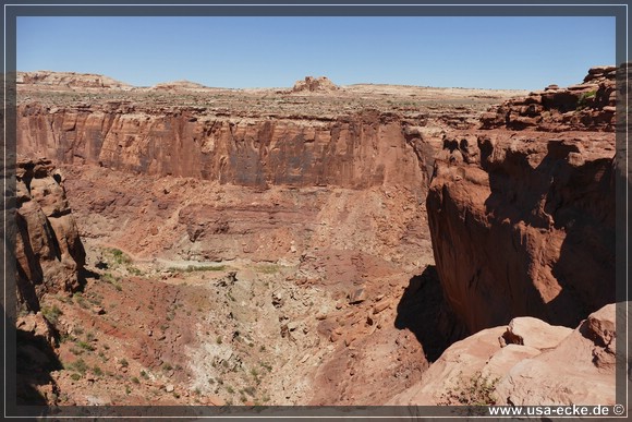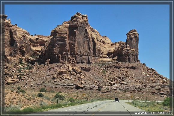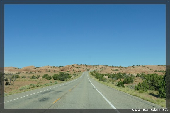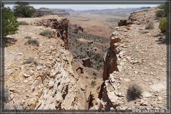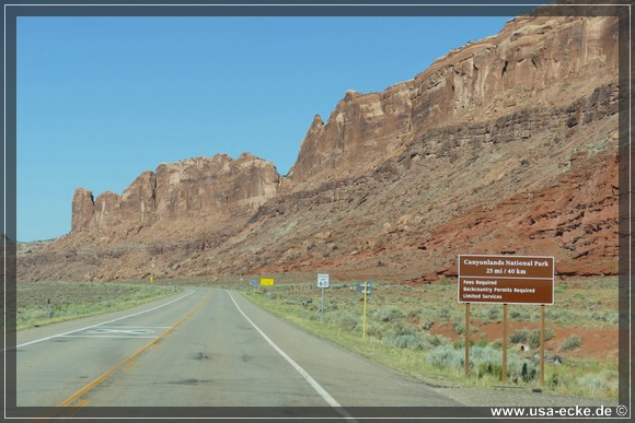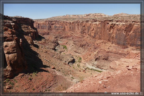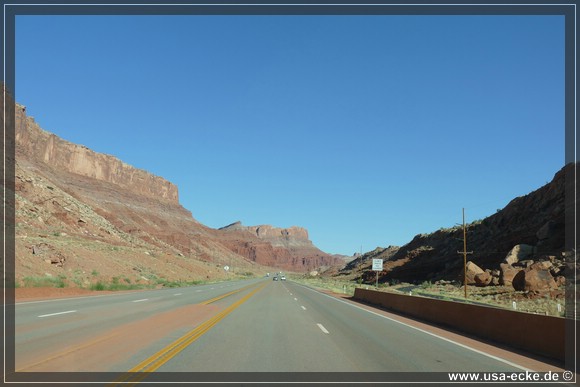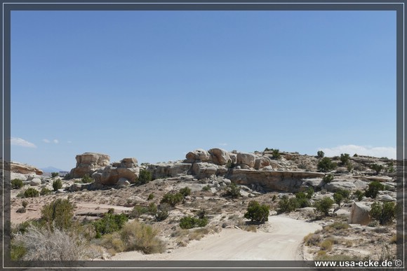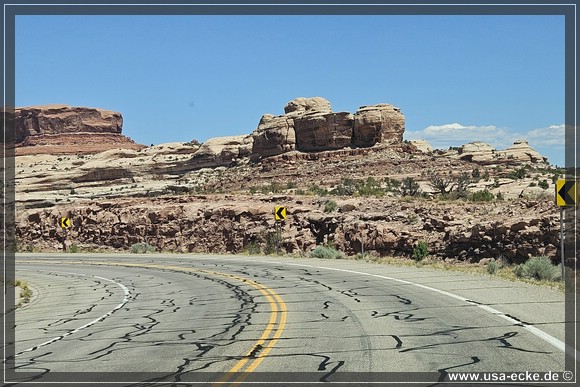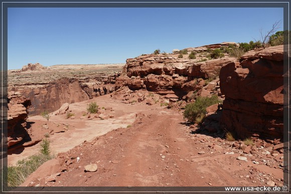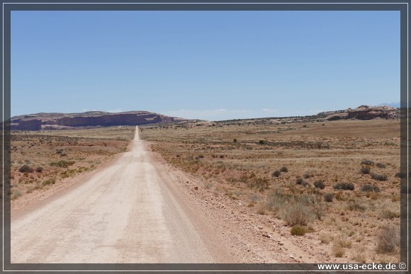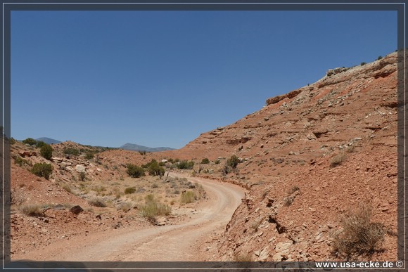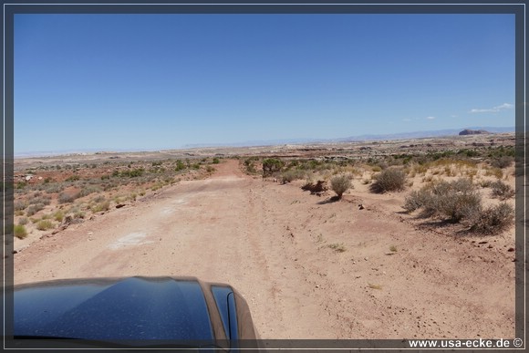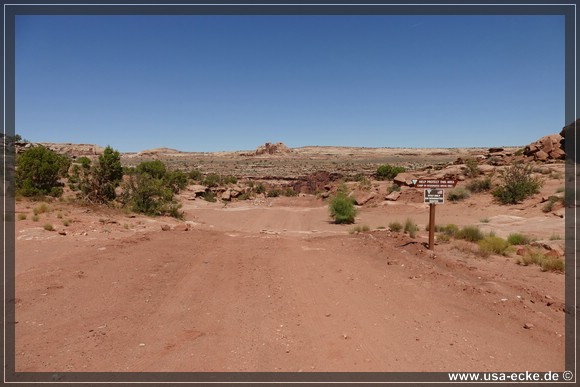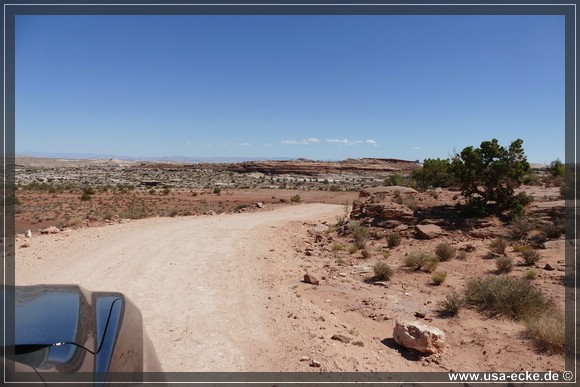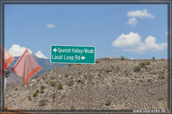 Von Moab aus geht es nach Norden ueber die US 191, von der die UT 313 links abzweigt. Diese fuehrt zum Dead Horse Point State Park sowie zum Canyonlands National Park. Nach 8,5 Meilen biegt man rechts in die BLM 137, die auch Spring Canyon Road heisst, ab. |