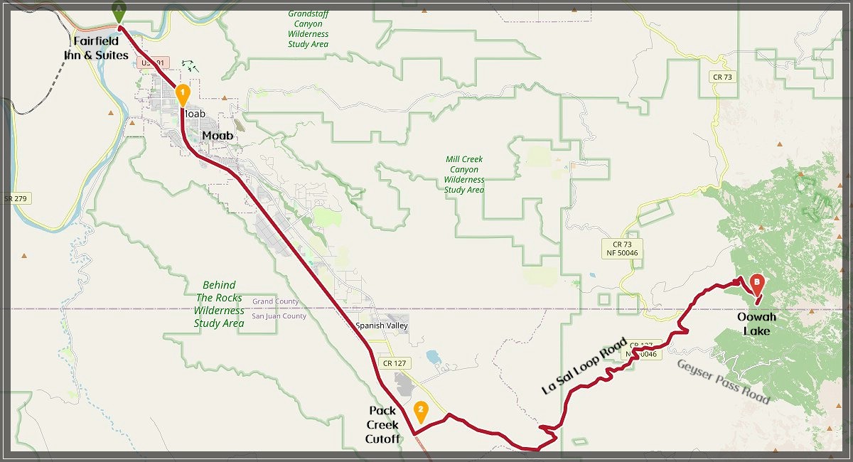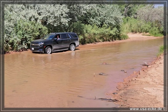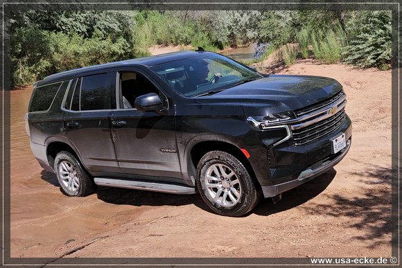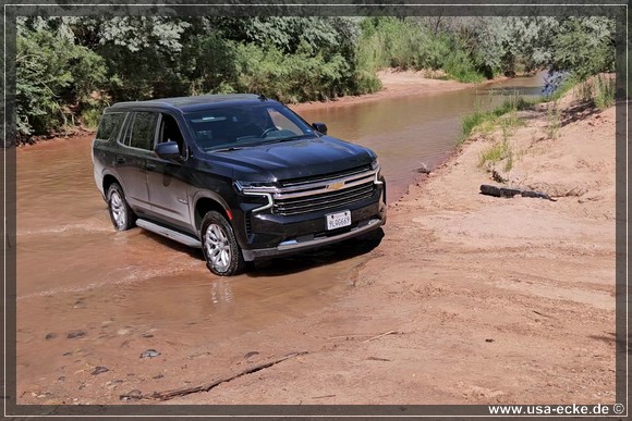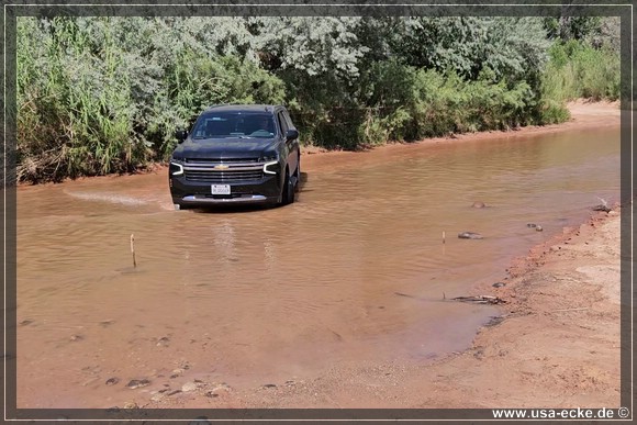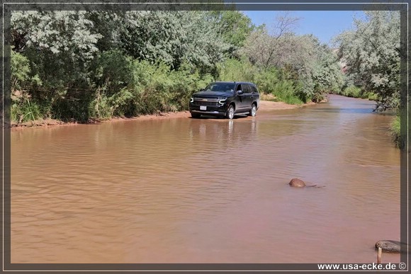 Fuer uns wird es langsam Zeit, wieder zurueck nach Moab zu fahren. Also verlassen wir den kleinen See und fahren ueber die Gravel Road zurueck zur La Sal Mountain Loop Road. In Moab angekommen muessen wir erst einmal unser Auto waschen. Nach den Fahrten der letzten Tage sieht unser Tahoe wirklich richtig schlimm aus, so wollen wir morgen nicht weiterfahren. |