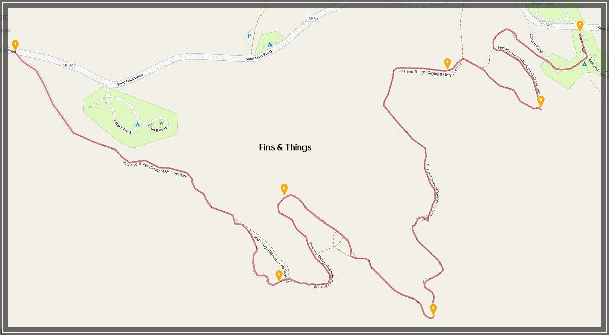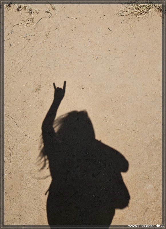 Wir haben jede Menge Spass, bereits dieser erste Teil haut uns total aus den Socken. Der Loop dauert gut eine Stunde, allerdings ist es wohl nur die Haelfte von Fins 'N' Things. Wir befinden uns ausschliesslich suedlich der Gravel Road der Sand Flats Recreation Area, der restliche Teil von Fins & Things ist wohl noerdlich davon. Bevor es weitergeht, machen wir direkt an der Einmuendung zur Sand Flats Road eine kurze Pause. |