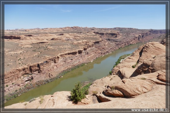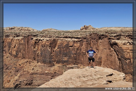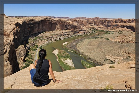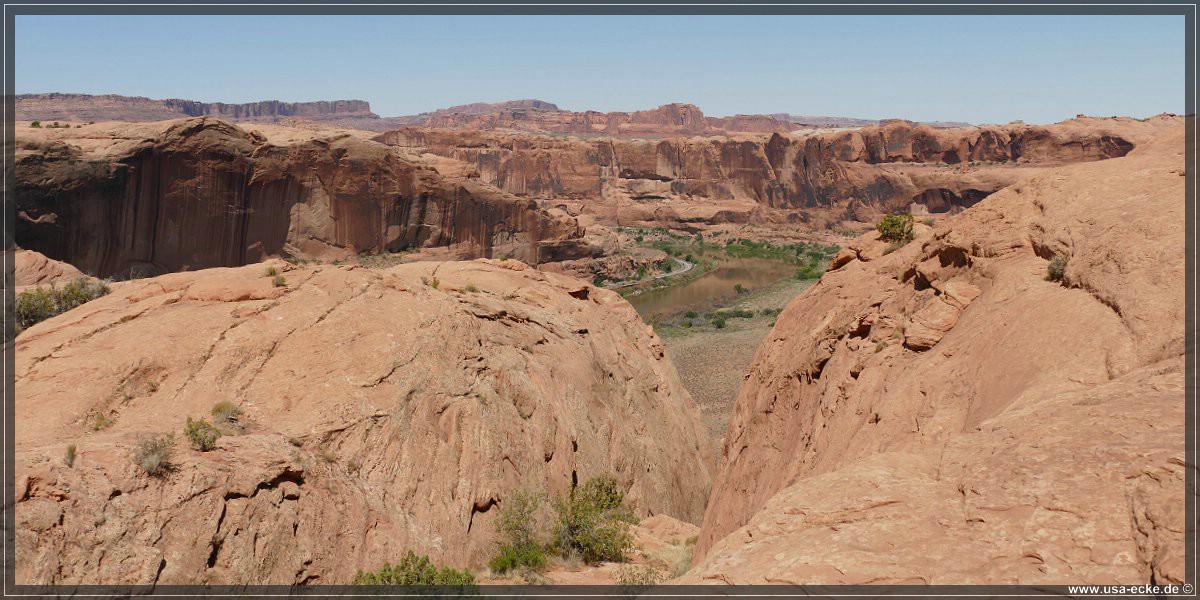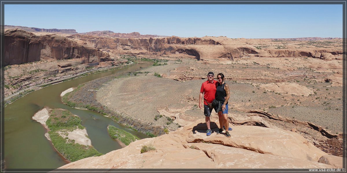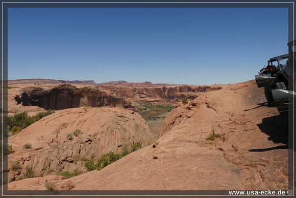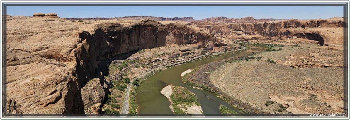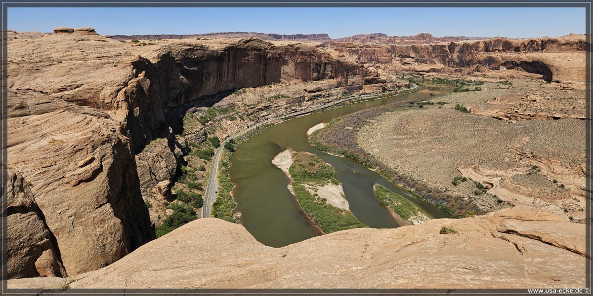 Nach der Haelfte der Fahrt stehen wir auf einmal direkt oberhalb des Colorado River und des Moab Scenic Byway 128, was auf unserer letzten Tour definitiv nicht der Fall war.