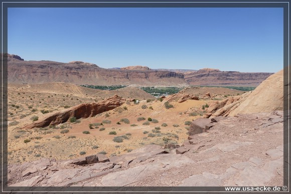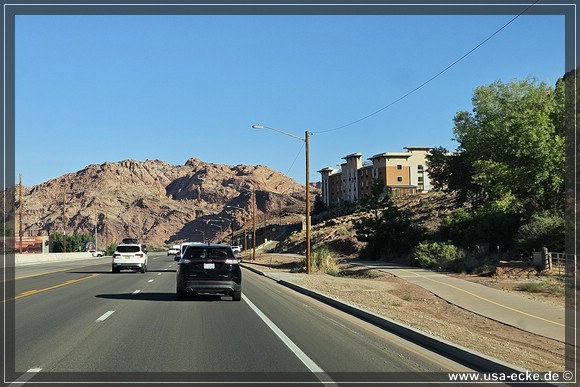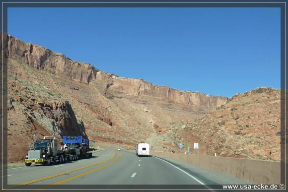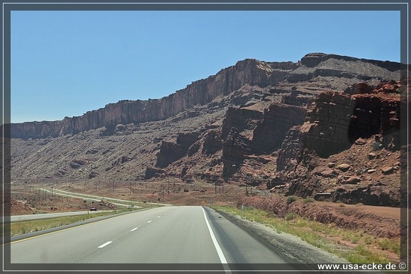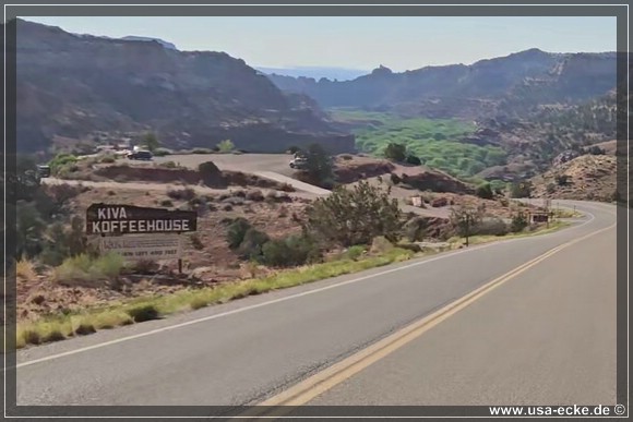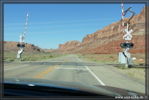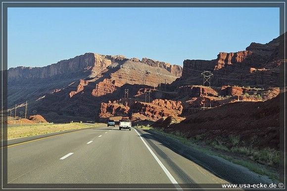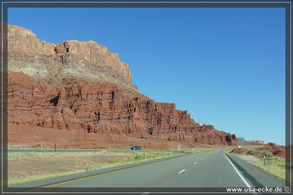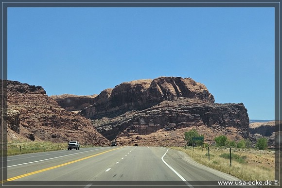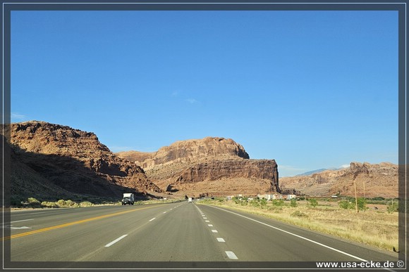 Um kurz nach 17.00 Uhr sind wir wieder zurueck auf der Teerstrasse und fahren ueber Hanksville bis nach Green River. Hier halten wir schnell fuer ein Sub, bevor wir die letzten Meilen in Angriff nehmen. Um 19.15 Uhr erreichen wir in Moab unser Alternativ-Hotel, das wir gestern Abend noch gebucht hatten. |