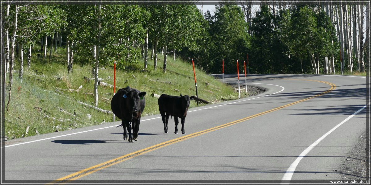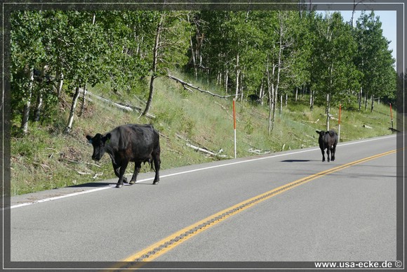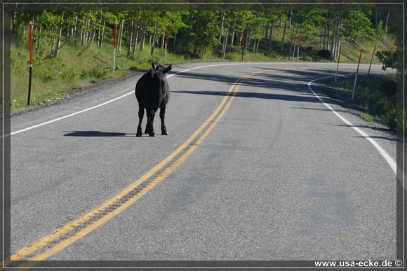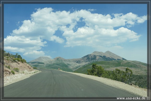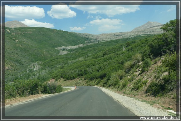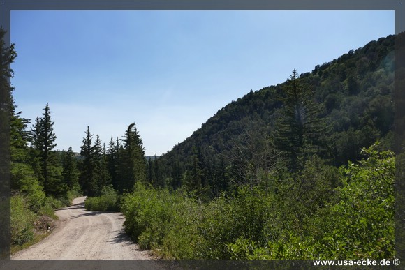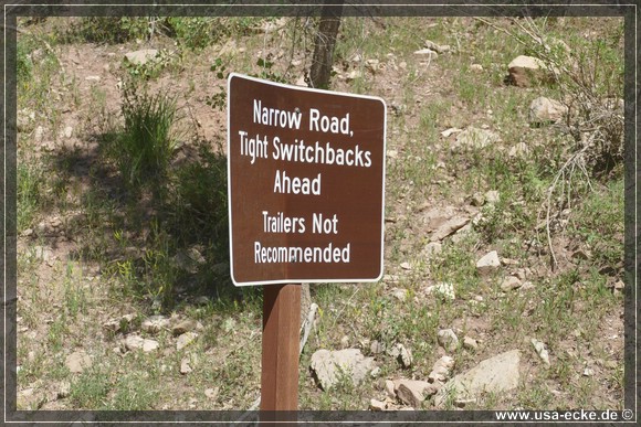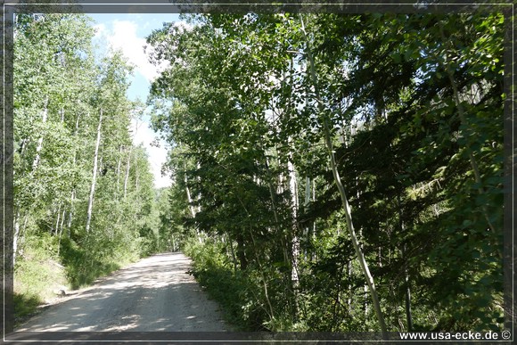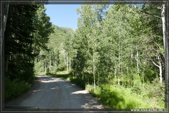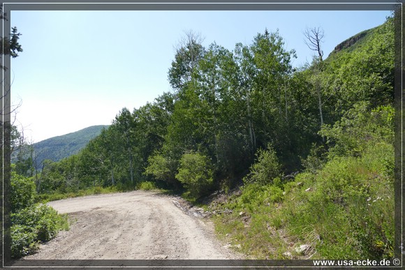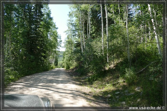 Egal – wir kommen ja wieder, es gibt noch so viel zu sehen hier in und um Moab. Die La Sal Mountain Loop Road kann aktuell wegen Bauarbeiten nur ueber den Pack Creek Cutoff angefahren werden. Die 1,1 Meilen lange Schotterstrasse ist aber in gutem Zustand und wir erreichen die Passstrasse trotz Baustelle relativ schnell. |