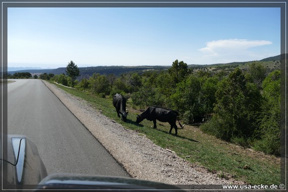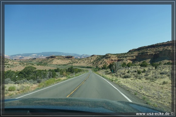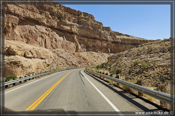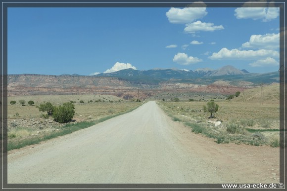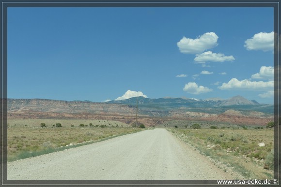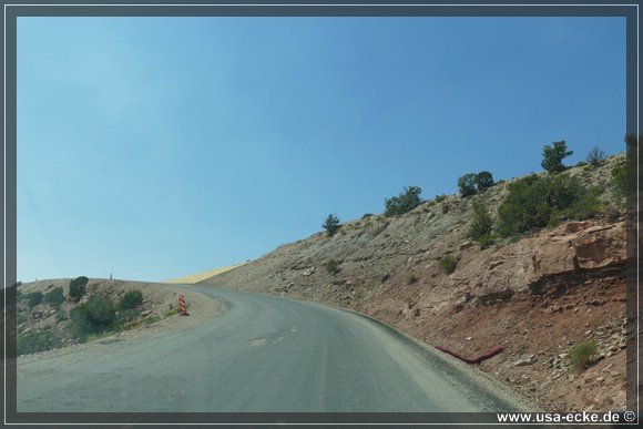 Zunaechst geht es ueber eine relativ langweilige Gravel Road, die erst im letzten Drittel interessanter wird. Von der Teerstrasse bis zu den Switchbacks, die nach Spring Canyon Buttom hinunterfuehren sind es 10,8 Meilen. Und das ist unser zweites Ziel fuer heute. Dachten wir… |