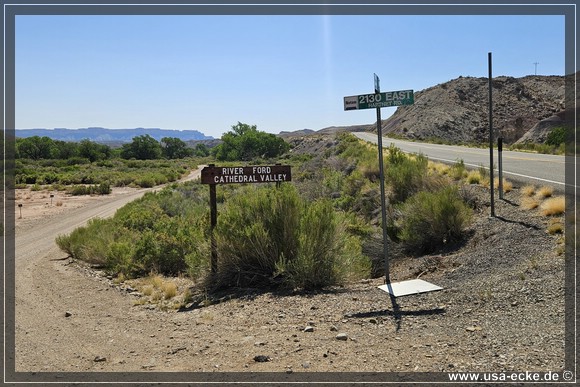 Am linken Strassenrand steht auf dem Schild "River Ford Cathedral Valley" und an dieser Stelle zweigt dann auch eine Gravel Road ab. Nach fast exakt einem Kilometer steht man am Fremont River, den man nun genau hier ueberqueren muss. |