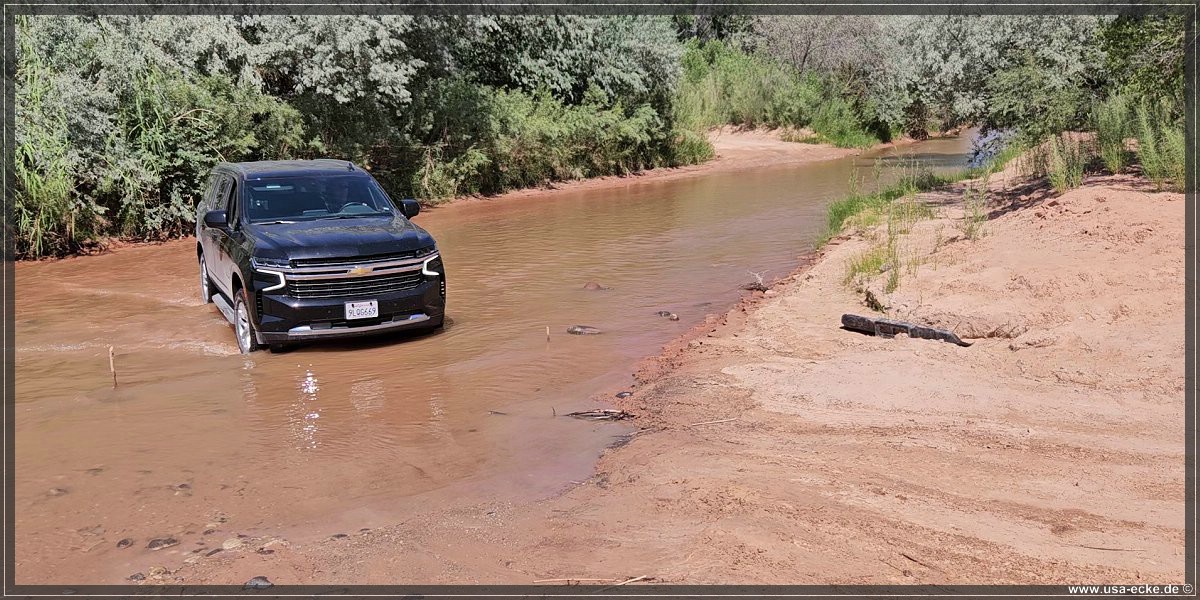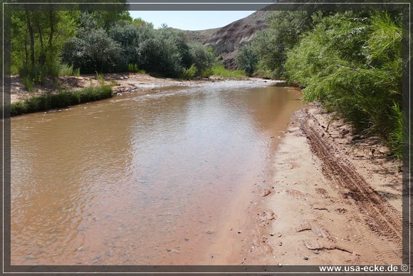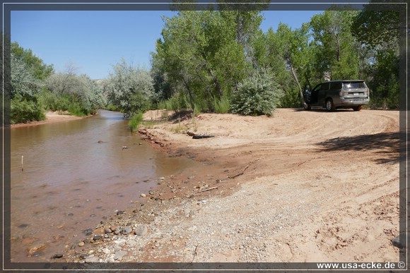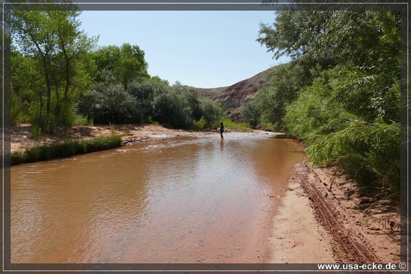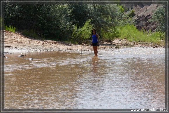 So steige ich erstmal aus und laufe barfuss durch den Fremont River, um festzustellen, wie tief denn das Wasser heute ist. Tatsaechlich geht es mir nur bis zu den Knoecheln, so dass eine Durchquerung normalerweise kein Problem darstellen sollte.