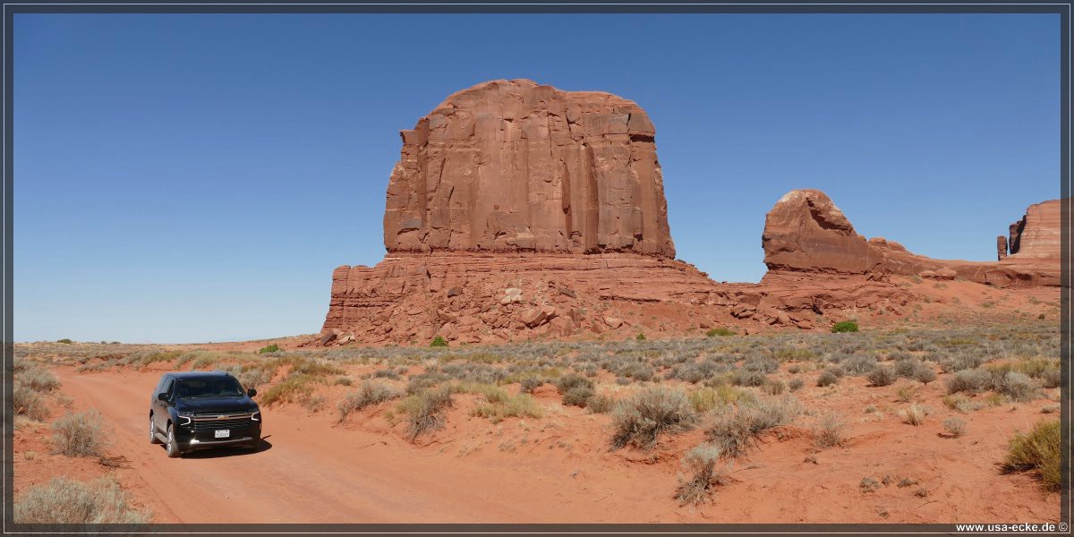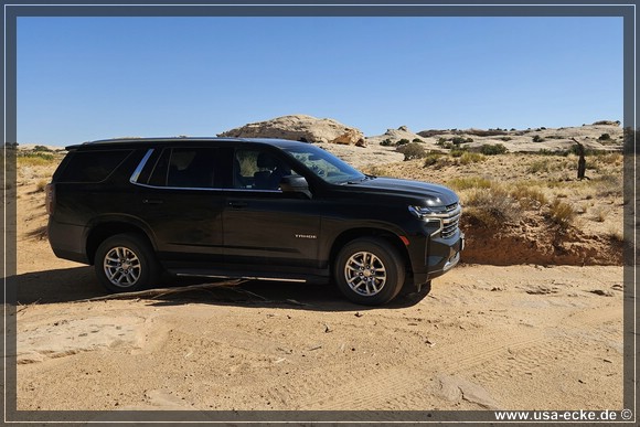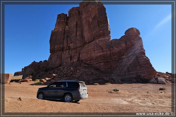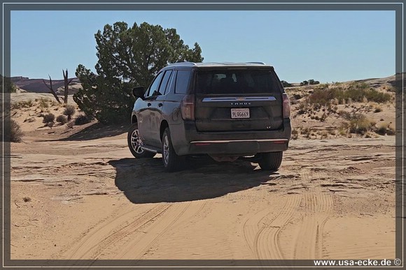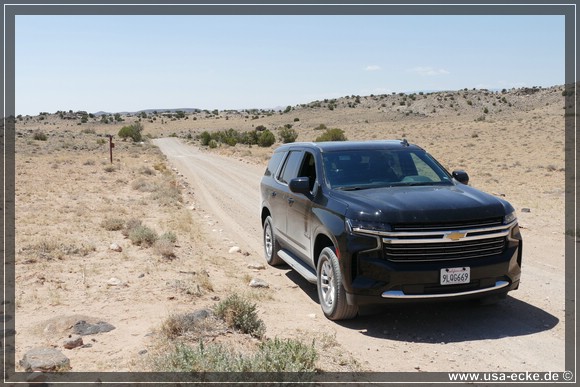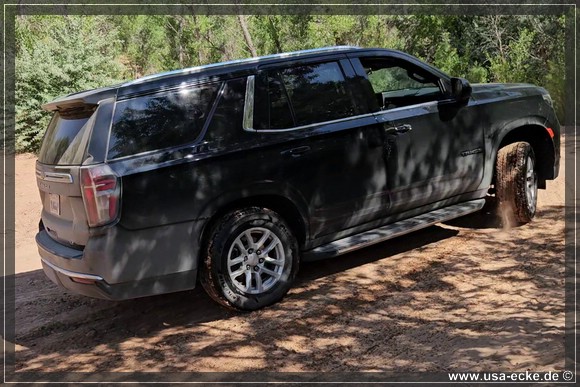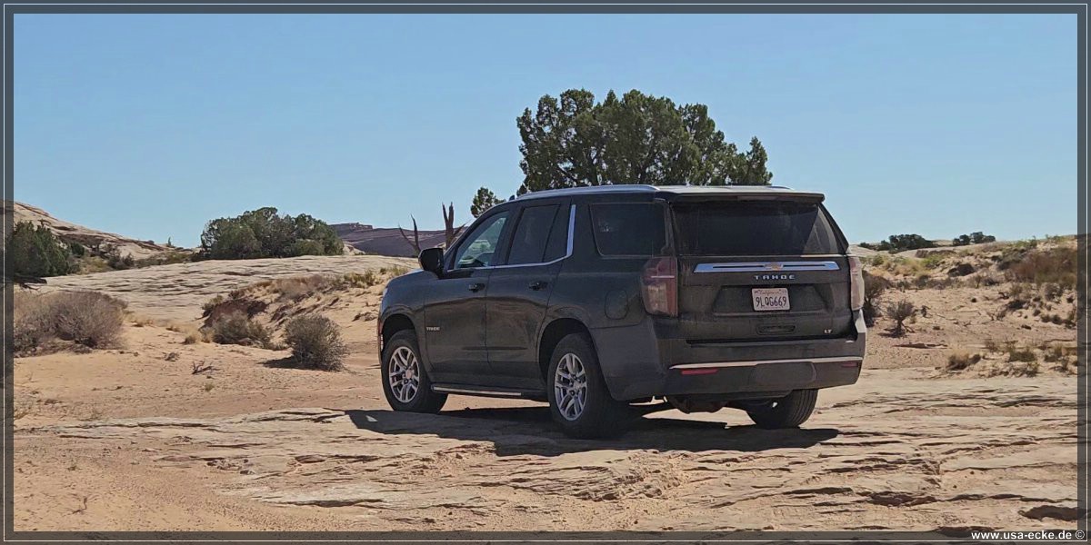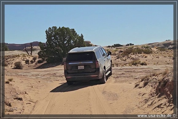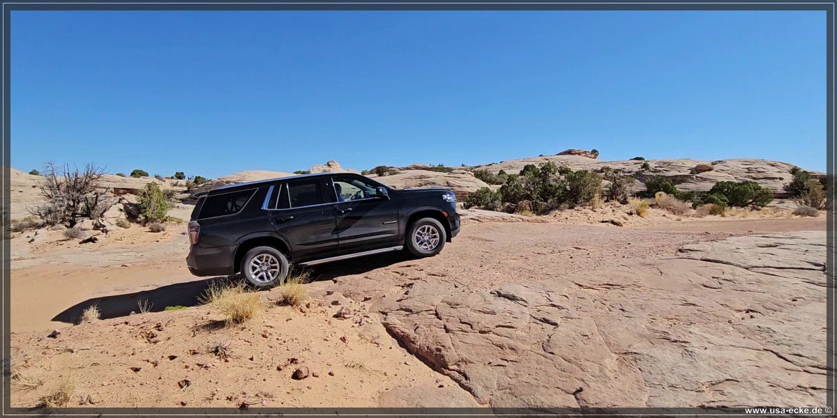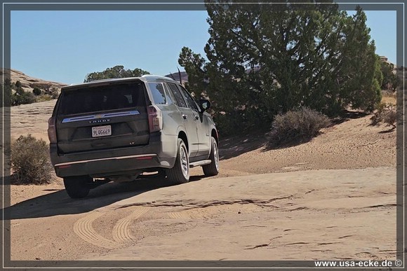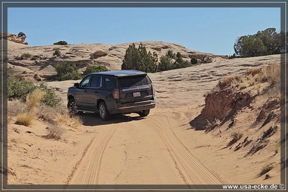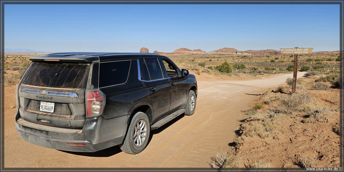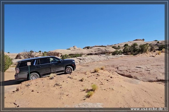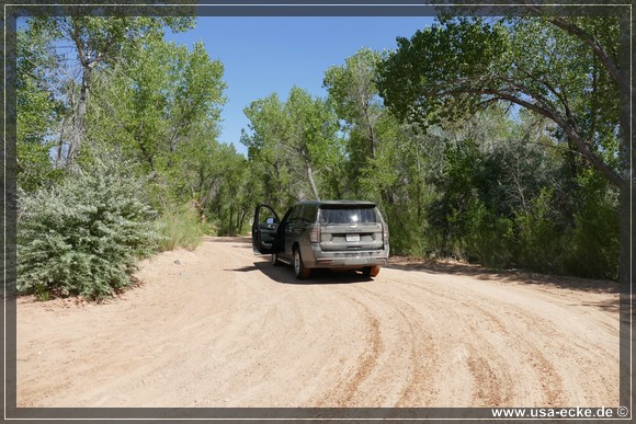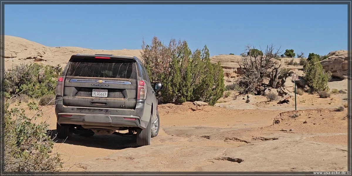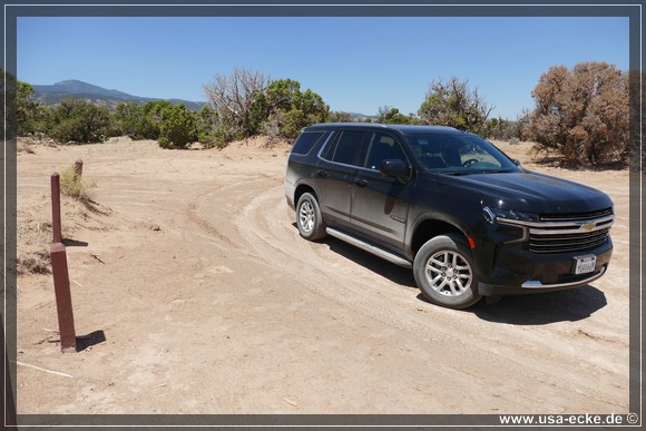 Ganz ehrlich – man sollte nach dem Cattle Guard parken und die eine Meile zum Secret Spire laufen. Die Secret Spire Road ist nur fuer Jeeps geeignet und auf keinen Fall fuer gemietete SUVs. Wir haben es versucht, mussten aber nach gut 200 Metern einsehen, das es besser ist, unseren Tahoe hier abzustellen.