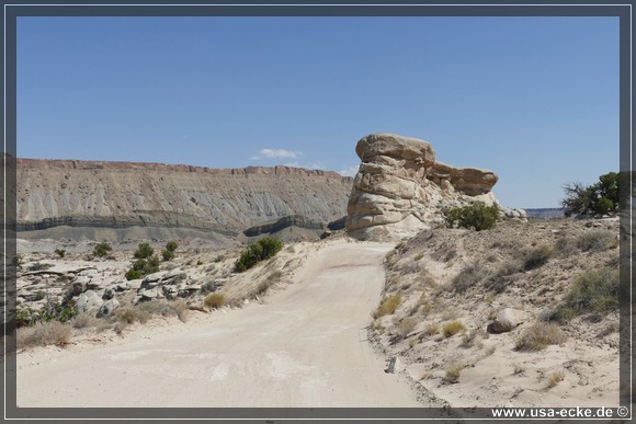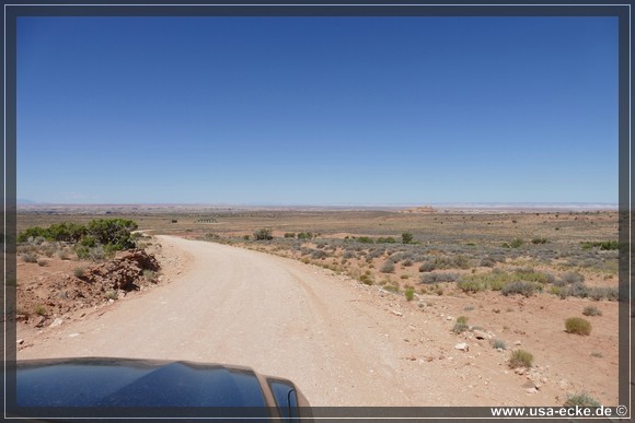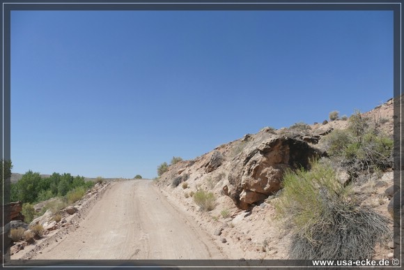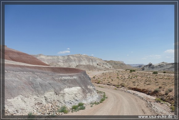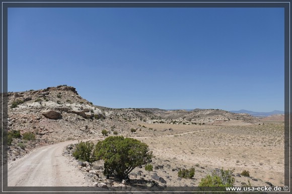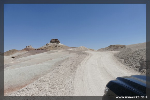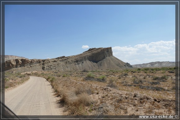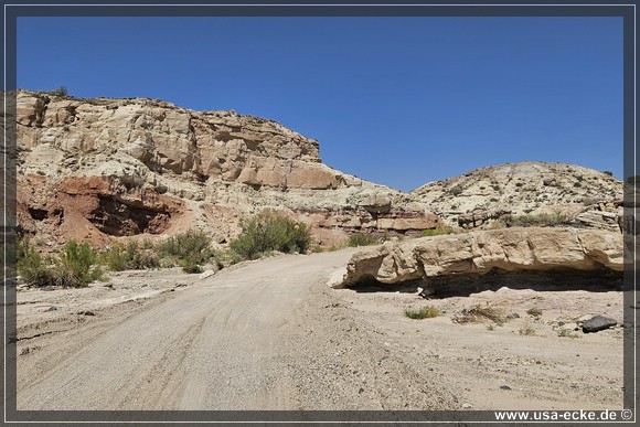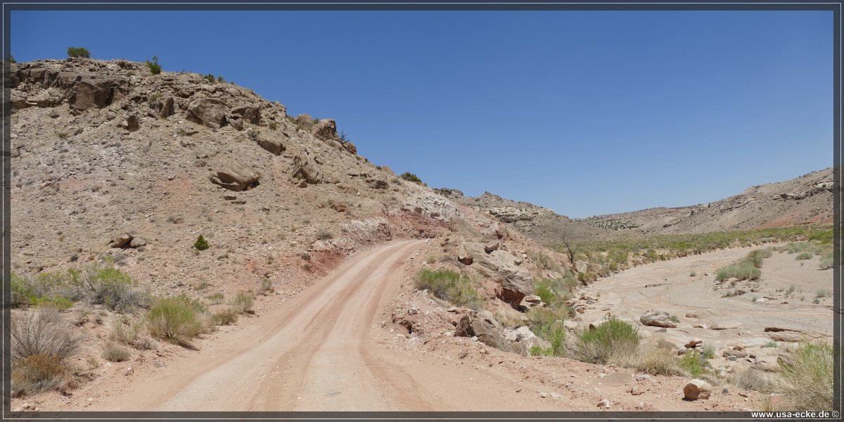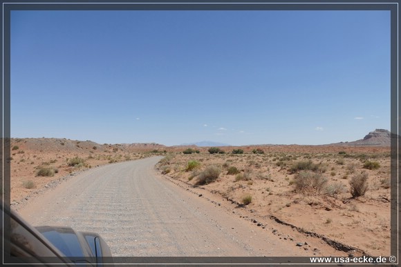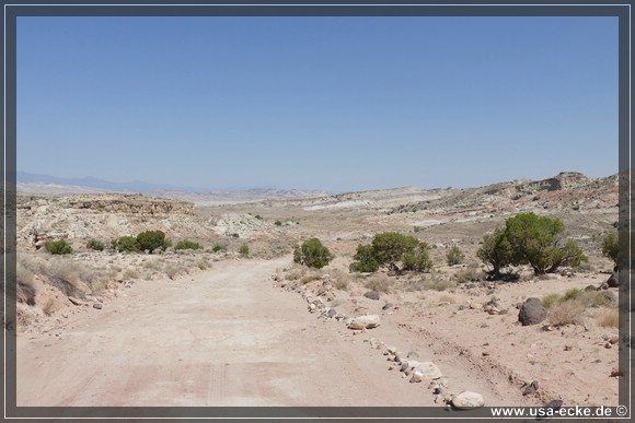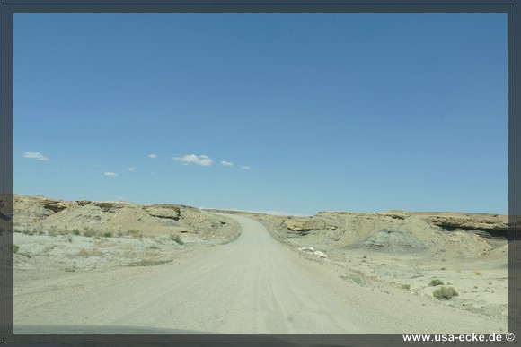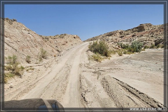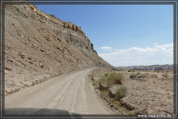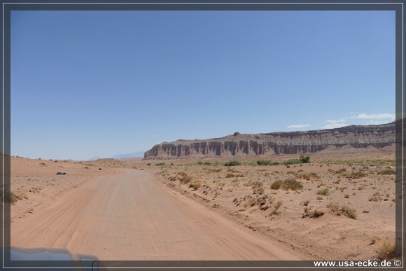 Auf dem Weg zurueck zur Factory Butte Road fahren wir nicht ueber die Skyline View Road, sondern die Coal Mine Road. Die ist allerdings auch nicht besser. Einzig die Factory Butte Road ist richtig klasse, hier gibt es nicht einmal eine Waschbrettbildung, sodass wir mit 50 mph wieder in Richtung Hwy 24 stauben koennen.