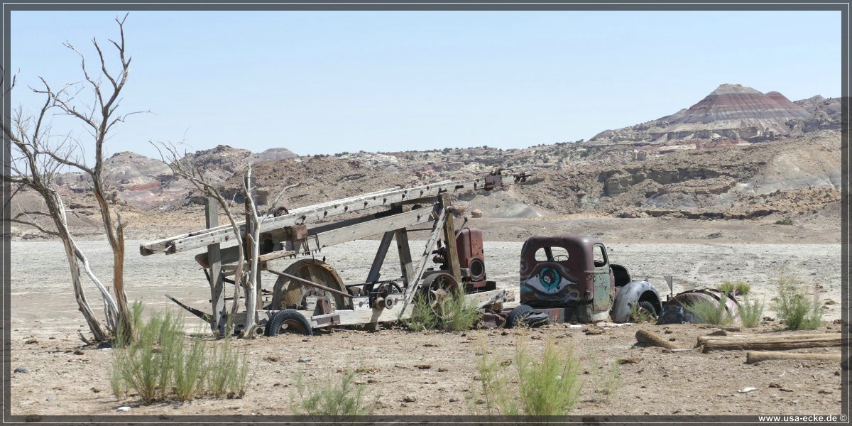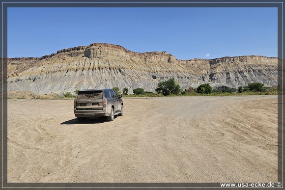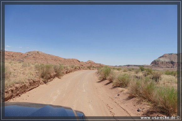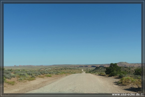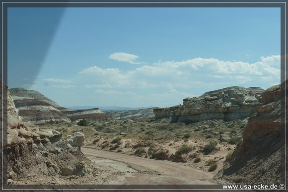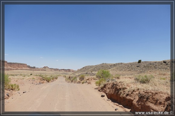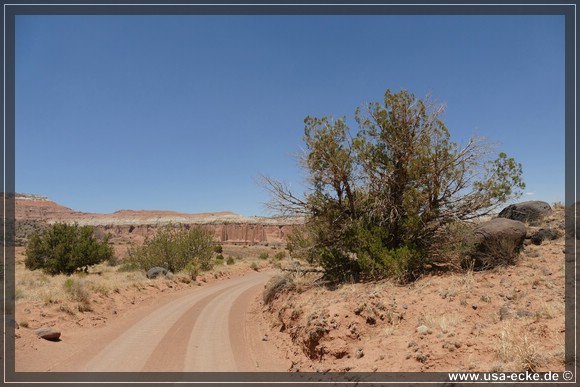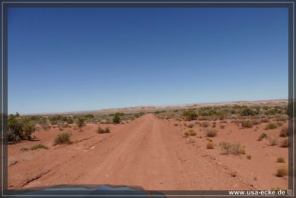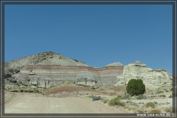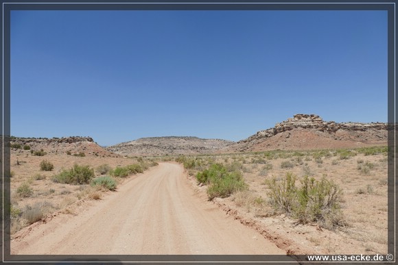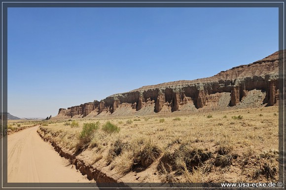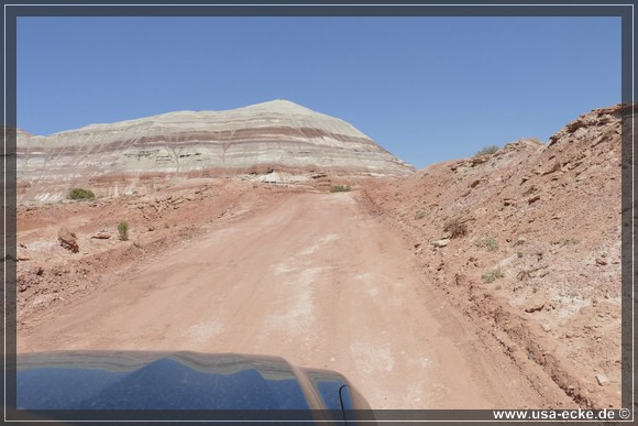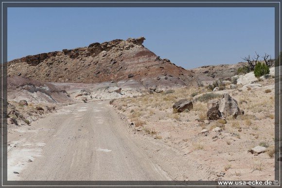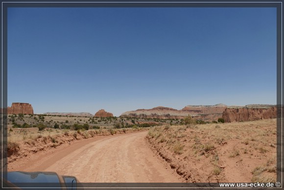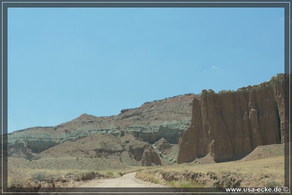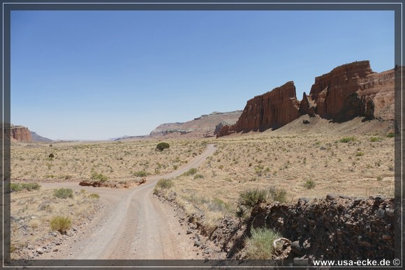 Auf dem Weg zurueck zur Factory Butte Road fahren wir nicht ueber die Skyline View Road, sondern die Coal Mine Road. Die ist allerdings auch nicht besser. Einzig die Factory Butte Road ist richtig klasse, hier gibt es nicht einmal eine Waschbrettbildung, sodass wir mit 50 mph wieder in Richtung Hwy 24 stauben koennen.