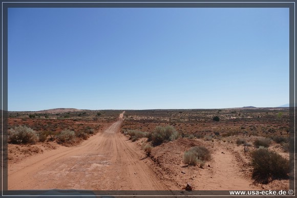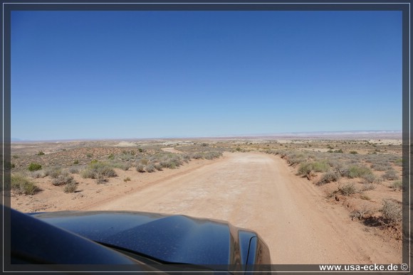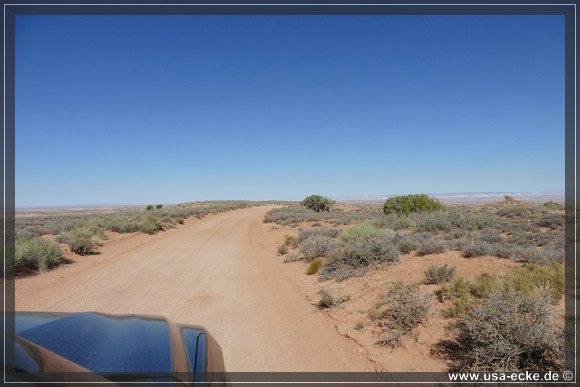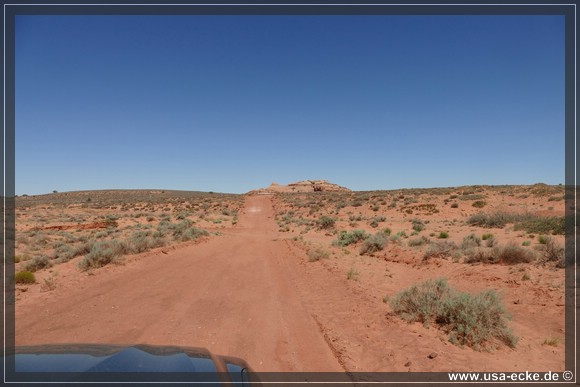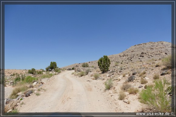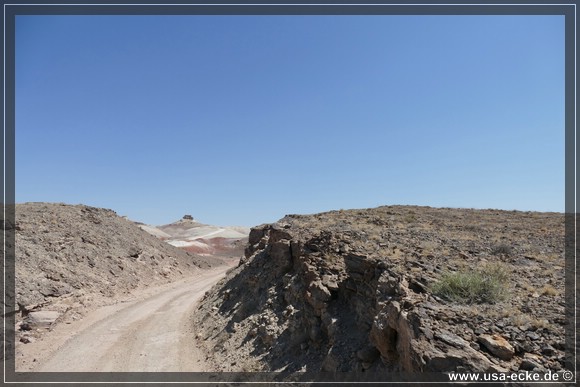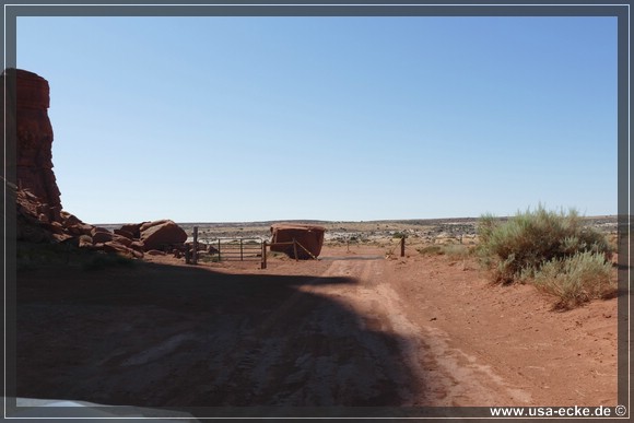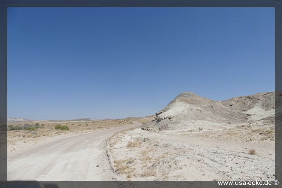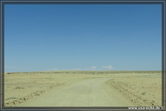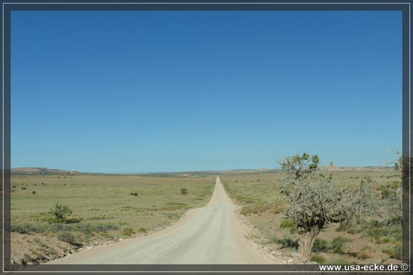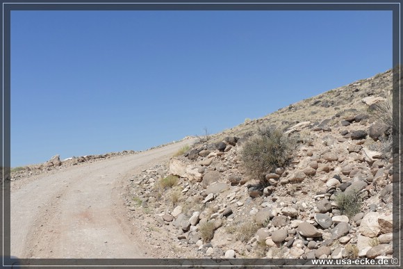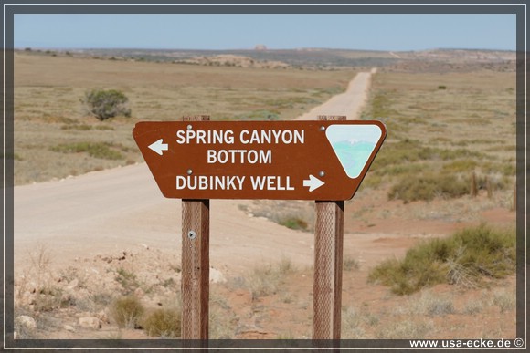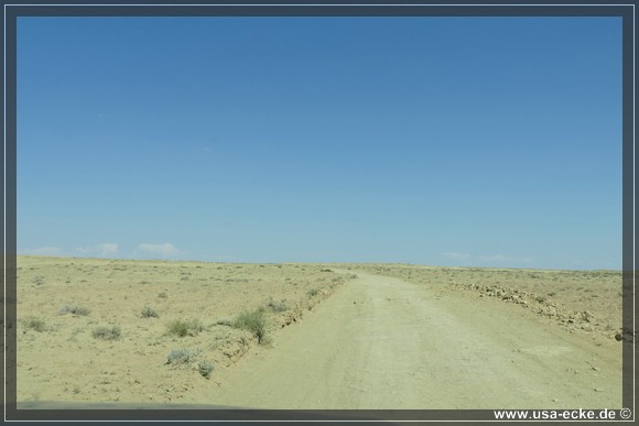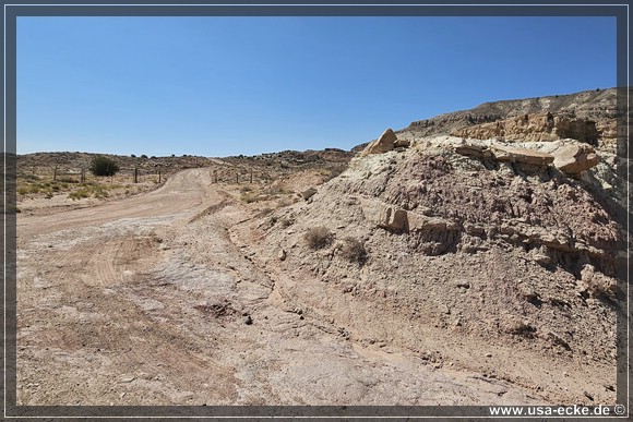 Weitere 1,4 Meilen spaeter biegt man wieder rechts auf die Dubinsky Well Road ab und folgt dieser fuer knapp fuenf Meilen. Wenn man am Ende ein Windrad sieht, ist man richtig. Noch bevor man dieses aber erreicht, gabelt sich die Strasse. Hier muss man nun links abbiegen und der an einigen Stellen etwas raueren Dirt Road, die auch Secret Spire Safari Route heisst, folgen. |
