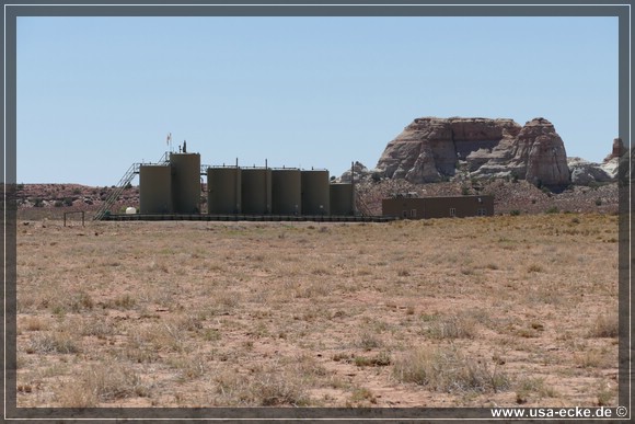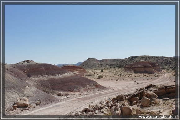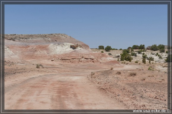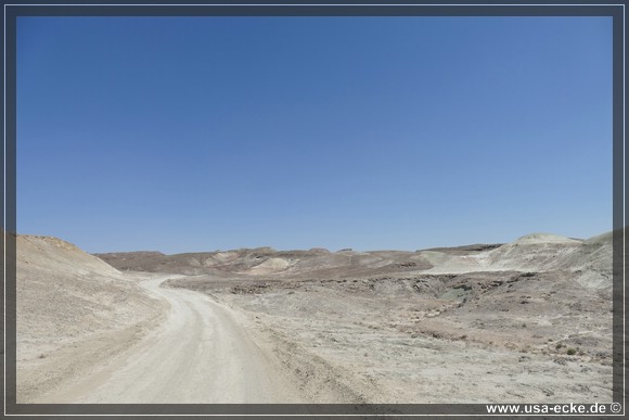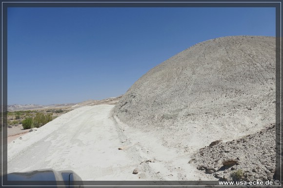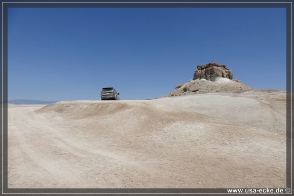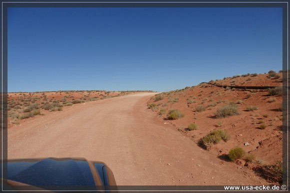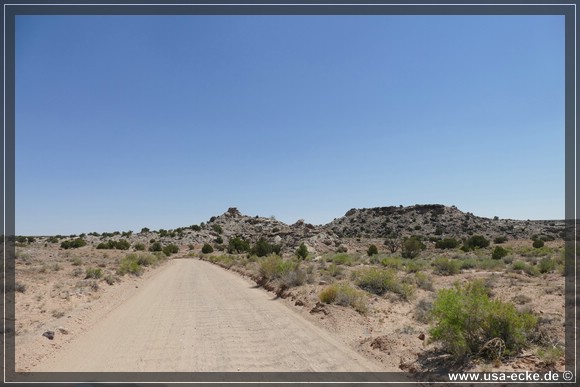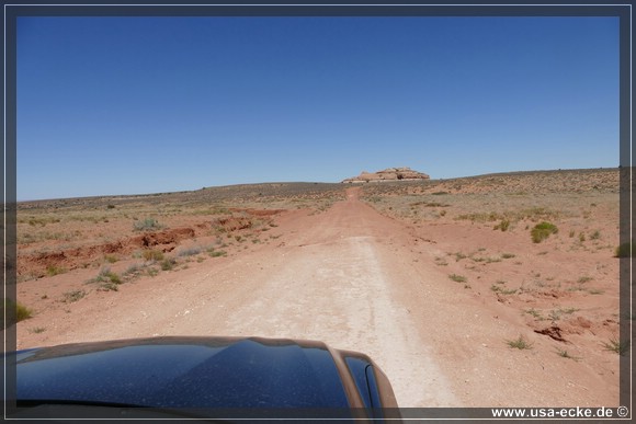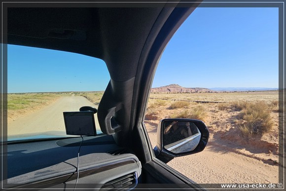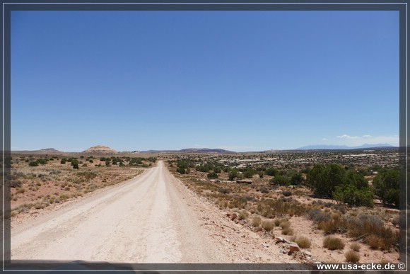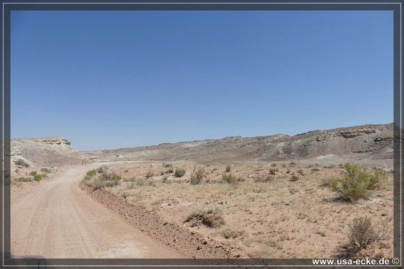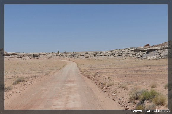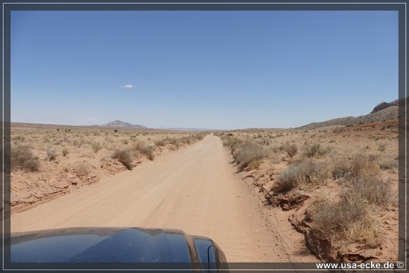 Weitere 1,4 Meilen spaeter biegt man wieder rechts auf die Dubinsky Well Road ab und folgt dieser fuer knapp fuenf Meilen. Wenn man am Ende ein Windrad sieht, ist man richtig. Noch bevor man dieses aber erreicht, gabelt sich die Strasse. Hier muss man nun links abbiegen und der an einigen Stellen etwas raueren Dirt Road, die auch Secret Spire Safari Route heisst, folgen. |