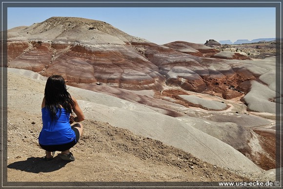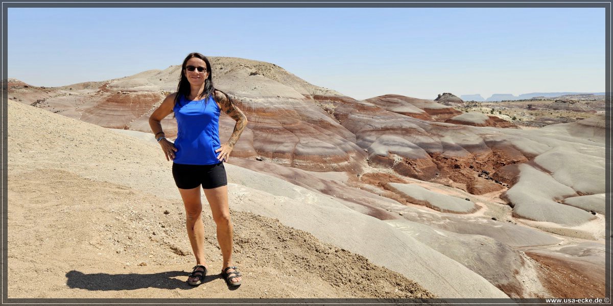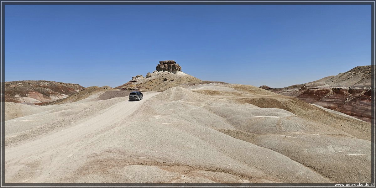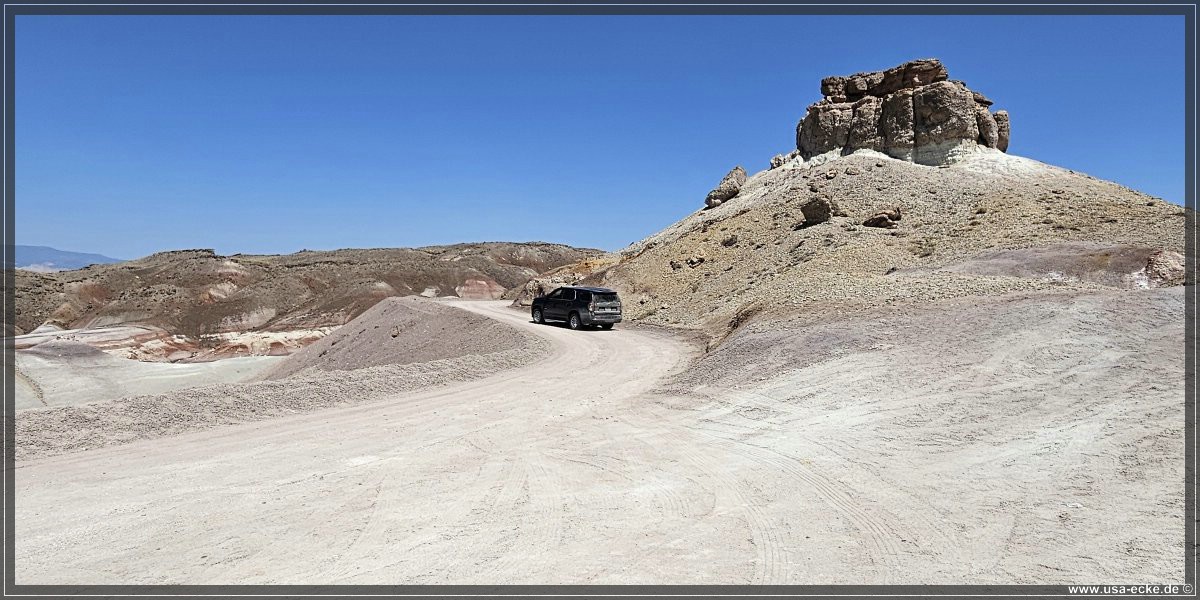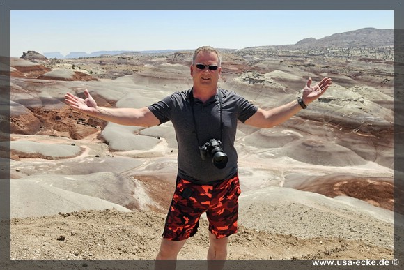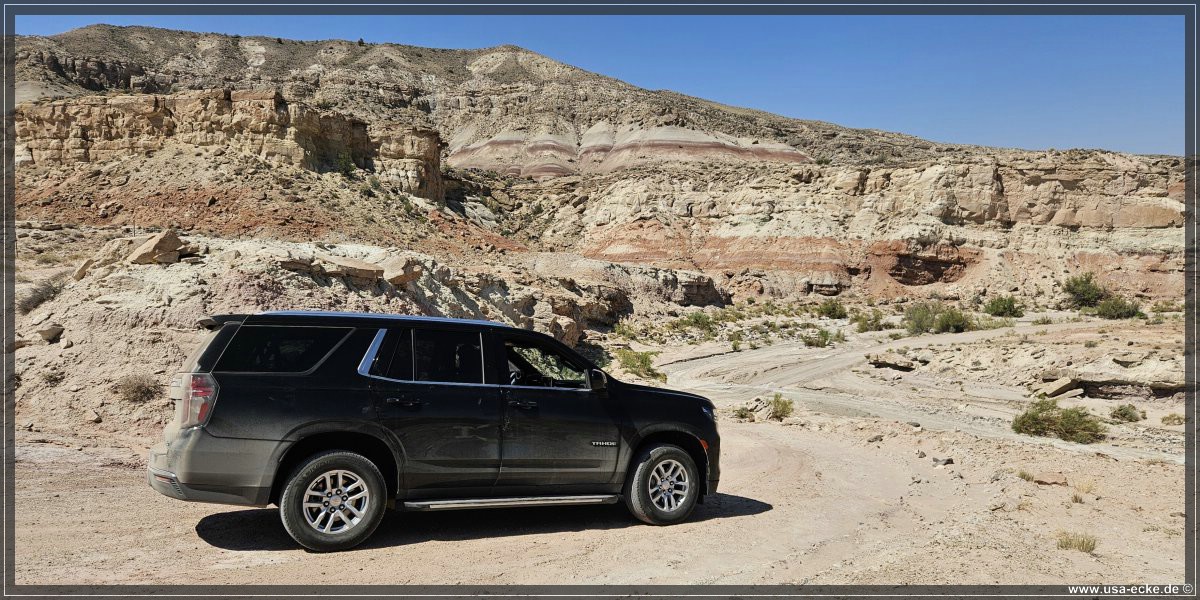 Erstes groesseres Highlight sind dann aber die Bentonite Hills, die man nach knapp neun Meilen Back Road erreicht. Wir steigen fasziniert aus unserem Tahoe und starren unglaeubig auf diese farbenfrohen Huegel, die wirklich nicht von dieser Welt zu sein scheinen. Jetzt haetten wir wieder mal gerne eine Drohne dabei, denn Luftaufnahmen von diesem Gebiet sind sicher der absolute Hammer. |