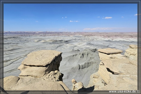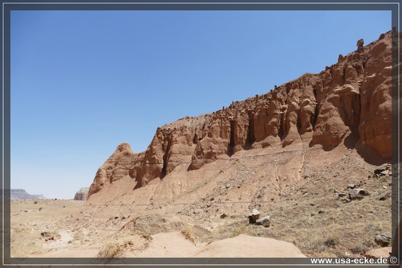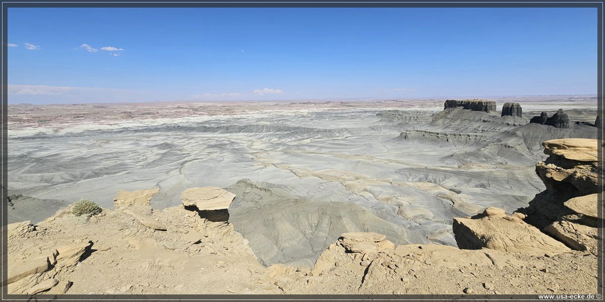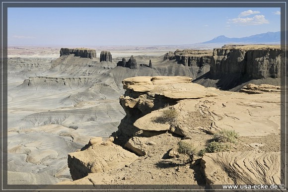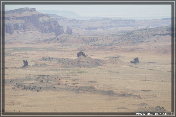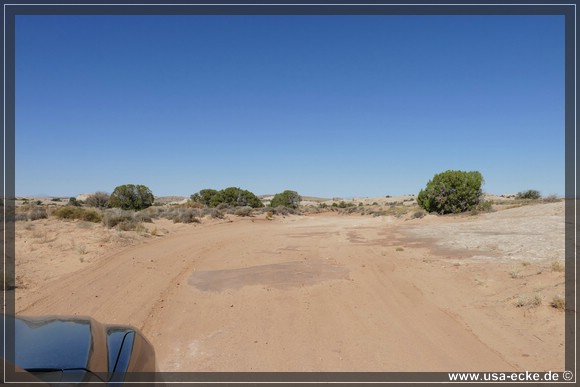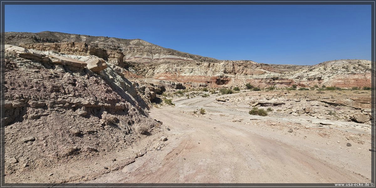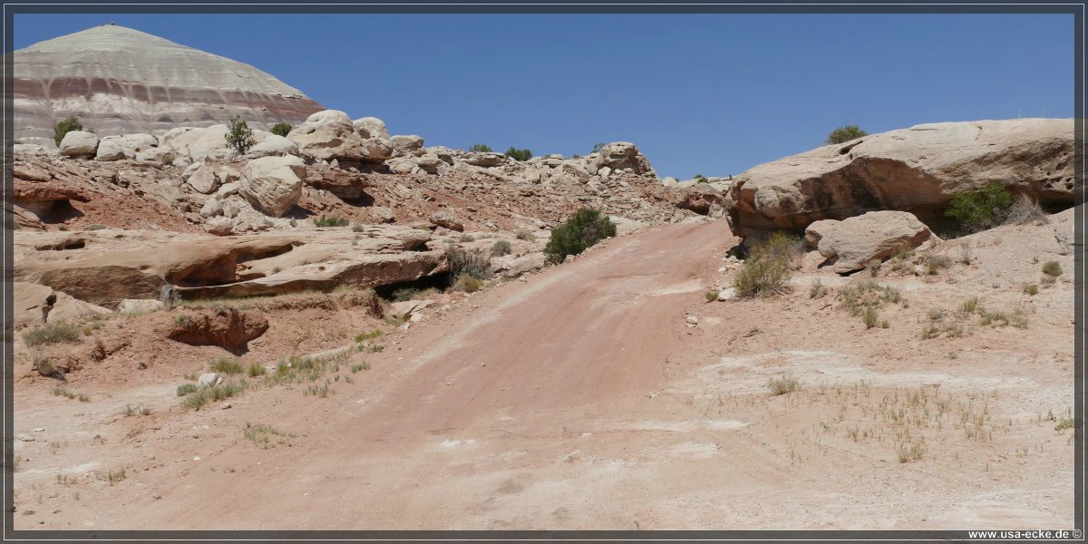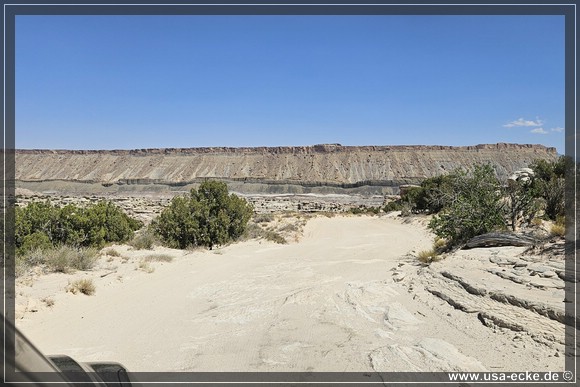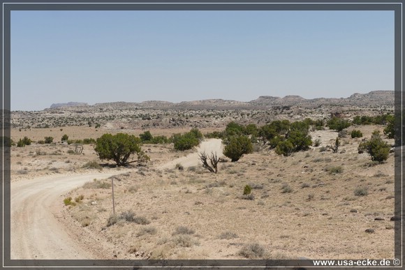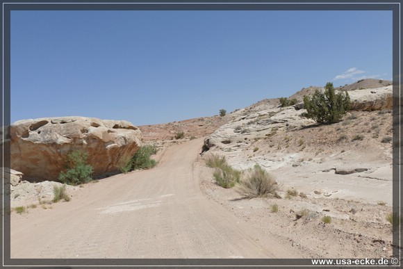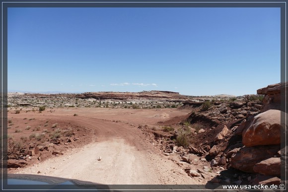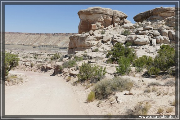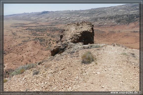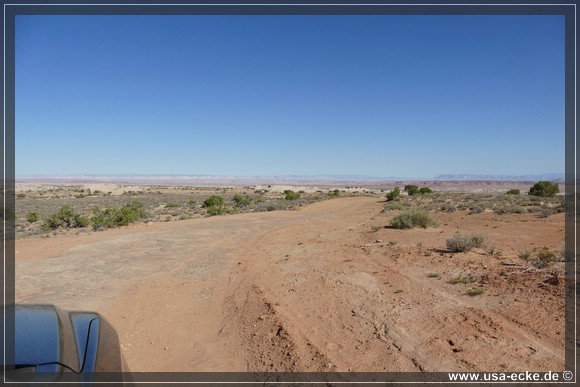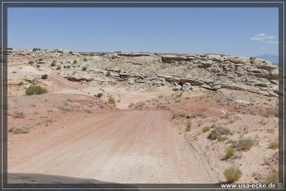 Rechts zweigt nun die Skyline View Road ab, die allerdings in erheblich schlechterem Zustand als die Factory Butte Road ist. Nach weiteren 1,9 Meilen geht es dann auf die 0,8 Meilen lange Moon Overlook Road, die gleich nochmal schlechter als die Skyline View Road ist. |