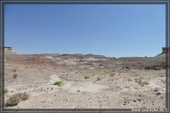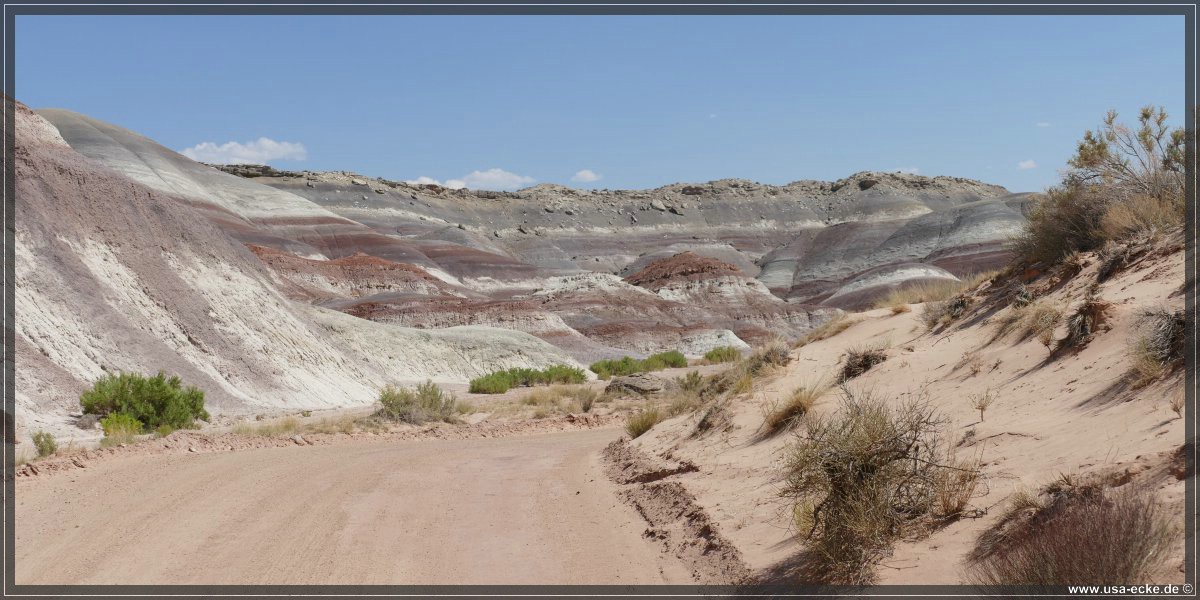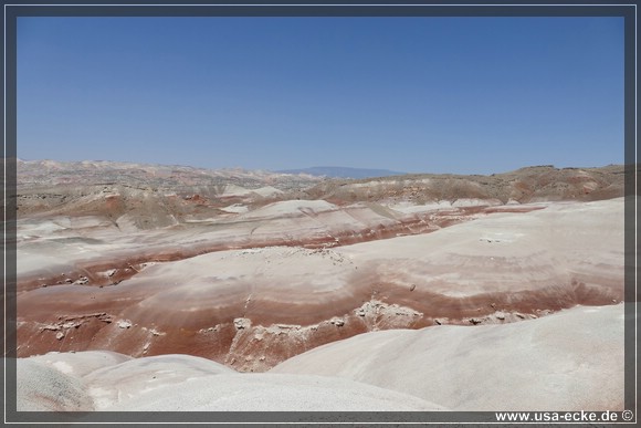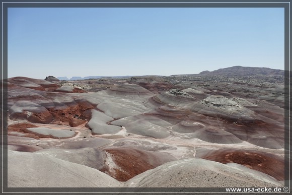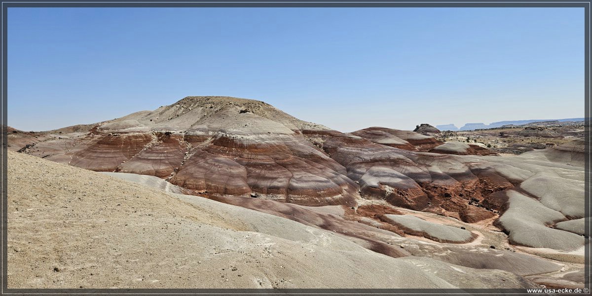 Am Ende kommt mit der Morrison Formation noch einmal eine farbenfrohe Huegel- und Berglandschaft, die zumindest eine kleine Aehnlichkeit mit den Bentonite Hills hat. |