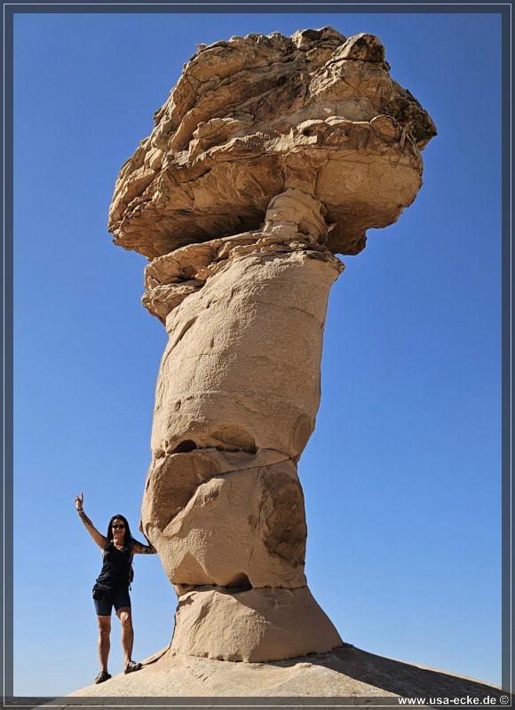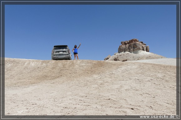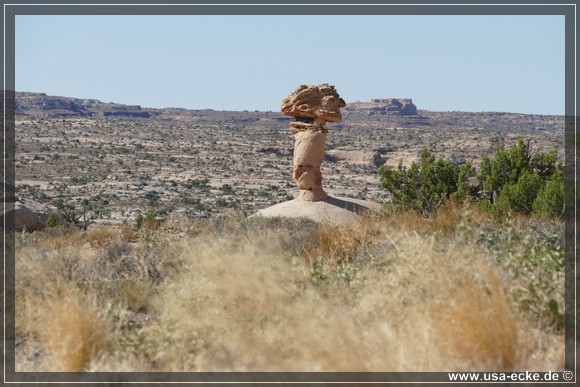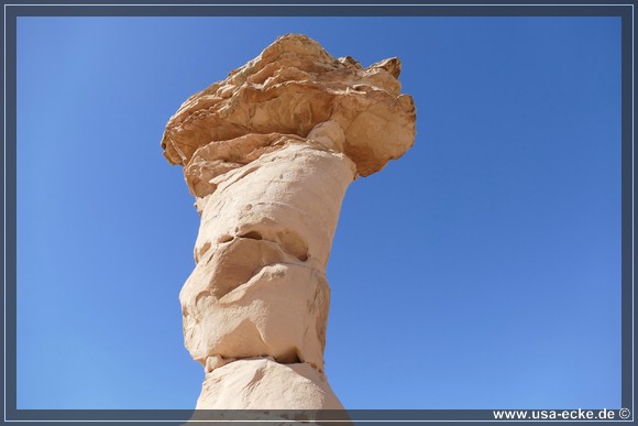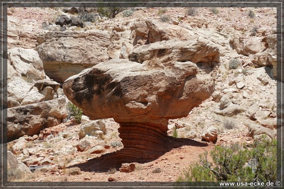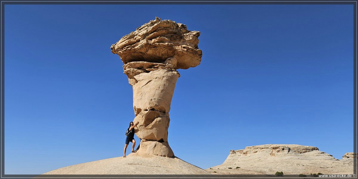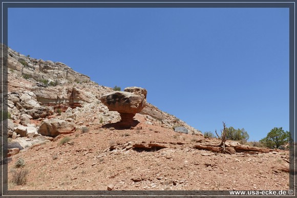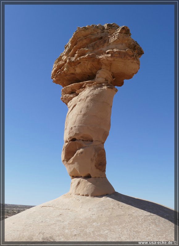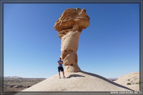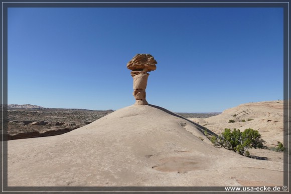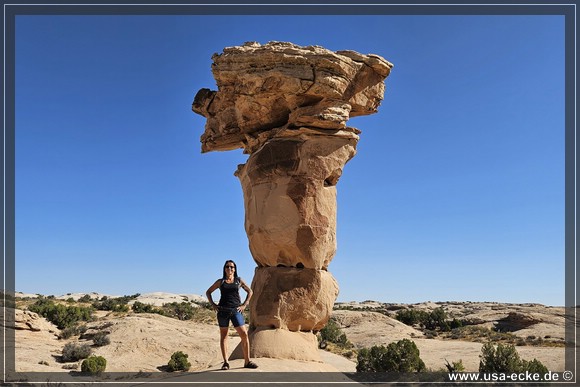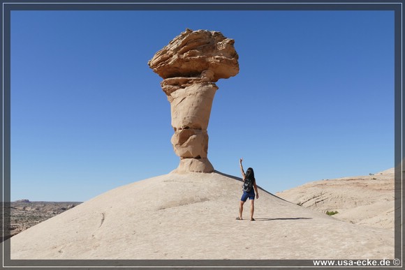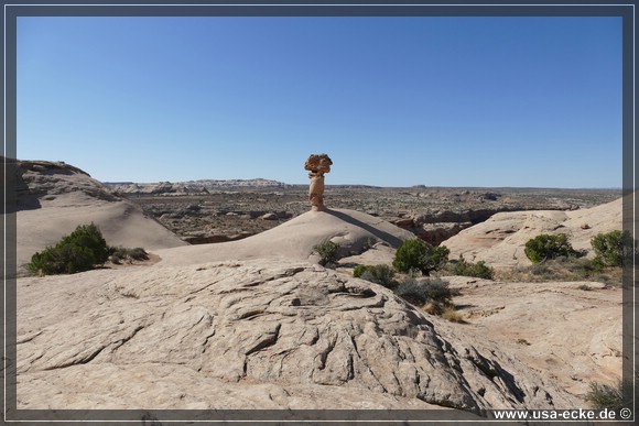 Die Felsnadel, die man durchaus als Hoodoo bezeichnen kann, ist schon kurios. Sie sieht wirklich so aus, als haette sie jemand hier auf den nackten Fels gestellt. Echt klasse und den Abstecher mit insgesamt 11,3 Meilen Back Road (oneway) absolut wert. |