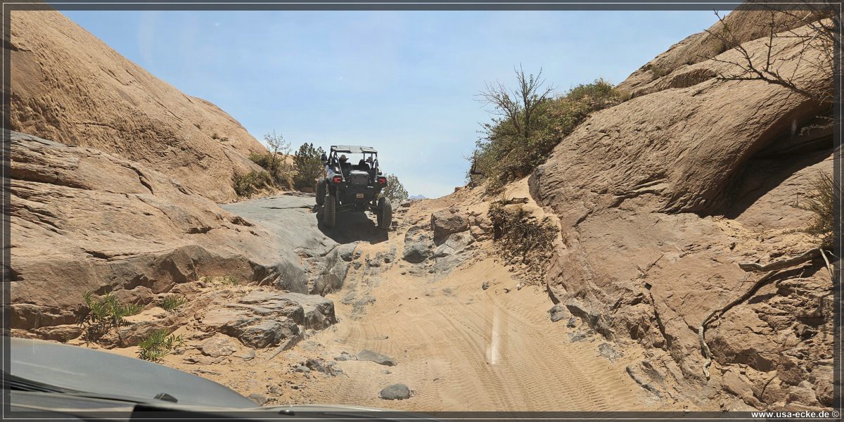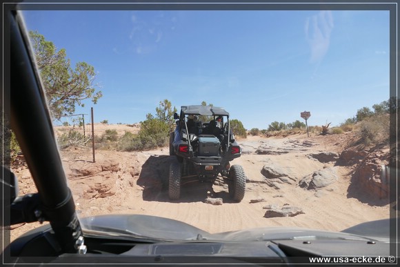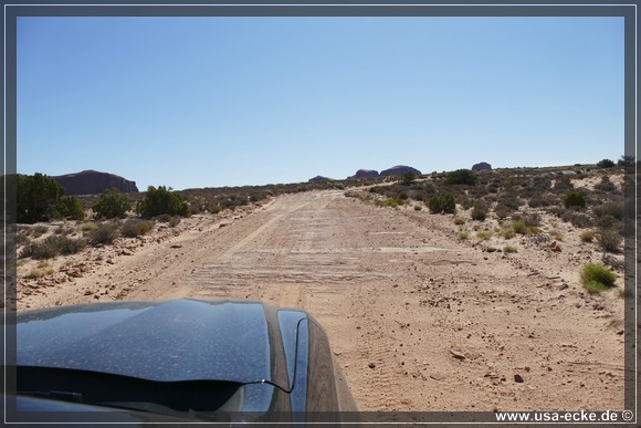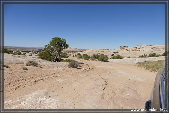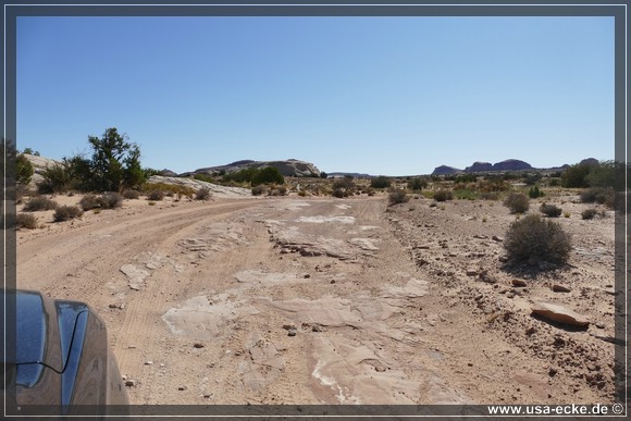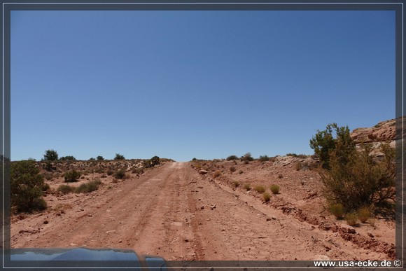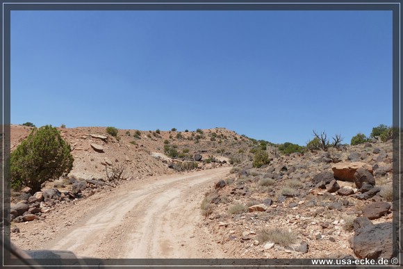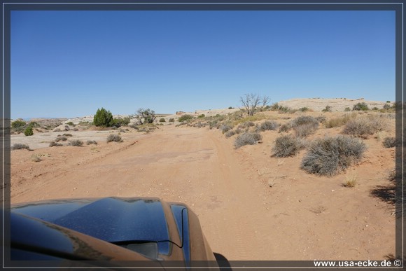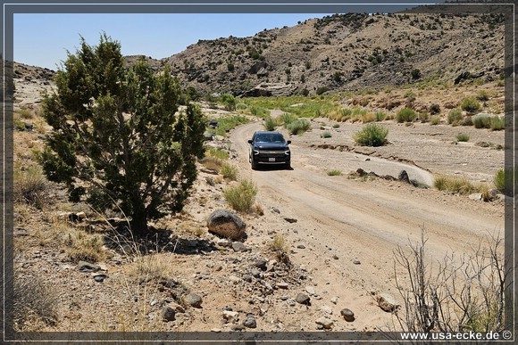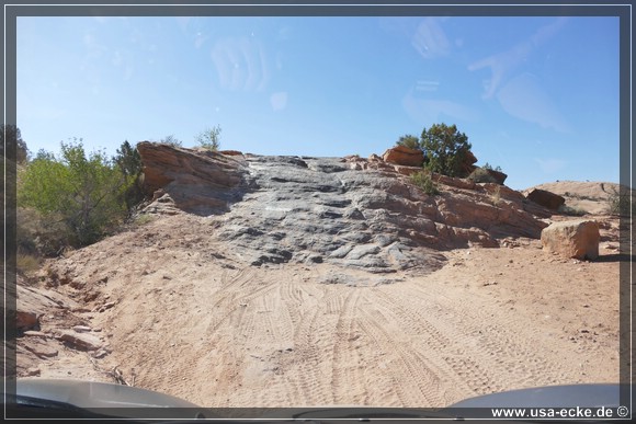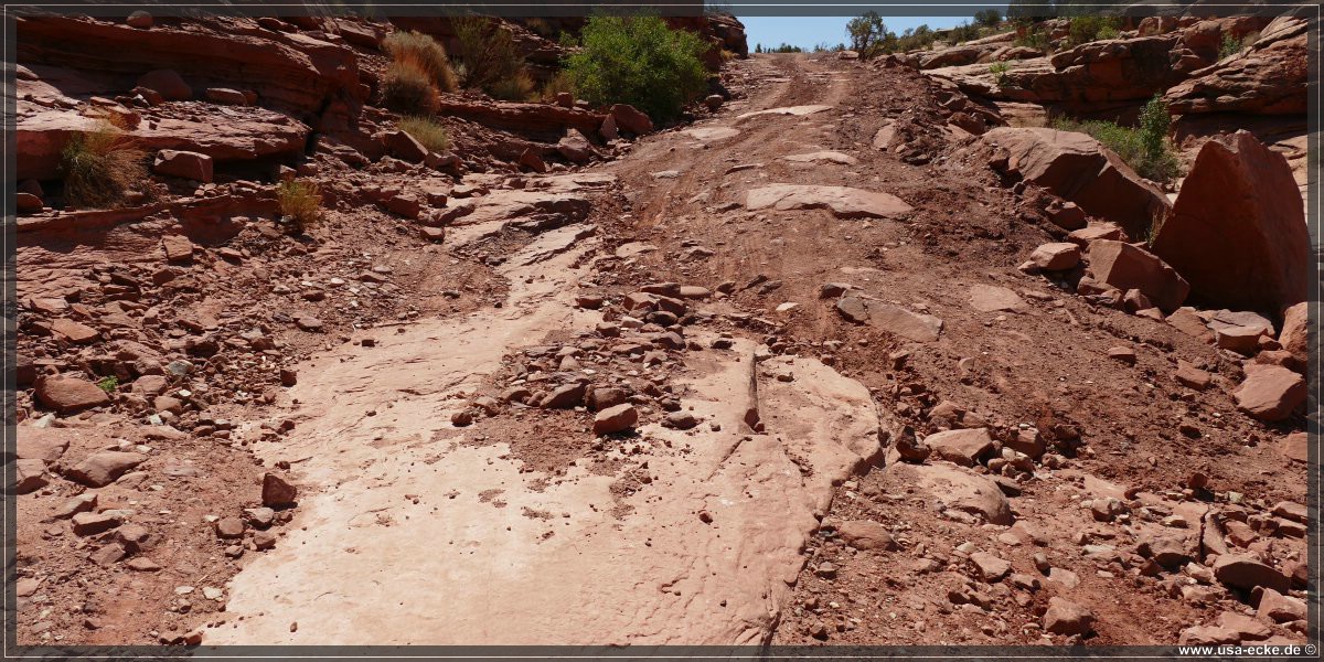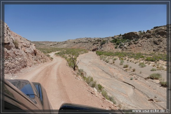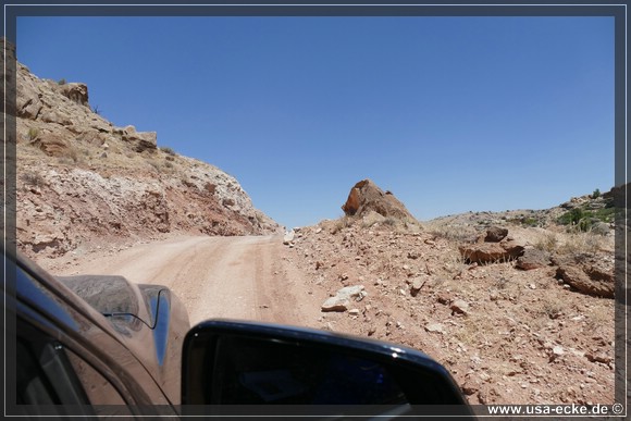 Um zum zweiten Tagespunkt zu kommen, muessen wir zurueck zur 9,6 Meilen entfernten Spring Canyon Road. Die ersten etwa 200 Meter auf der Secret Spire Road sind schon uebel, erst als wir wieder zurueck auf der Secret Spire Safari Route sind, wird es besser. |