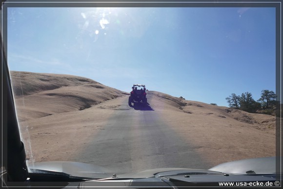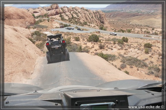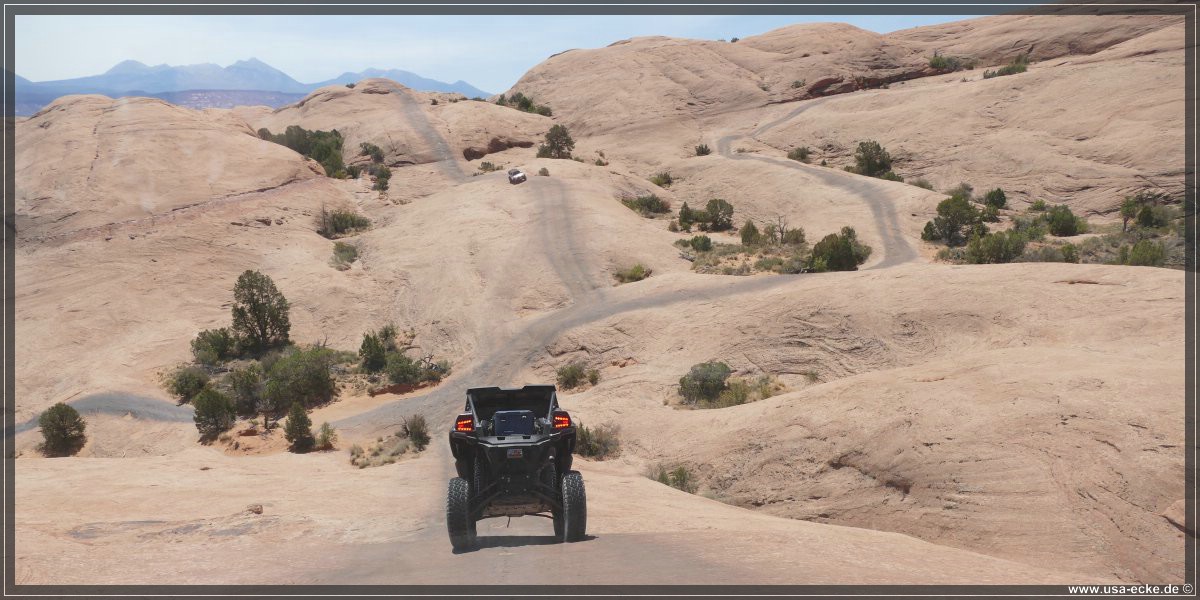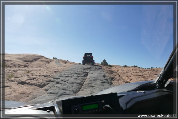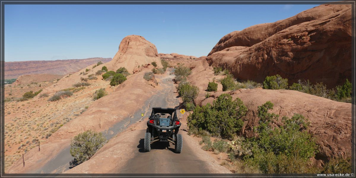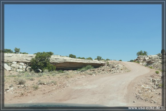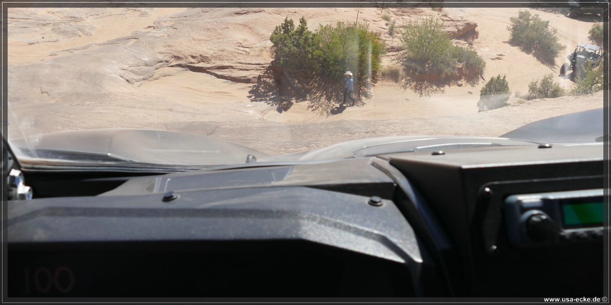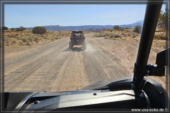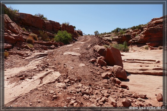 Um zum zweiten Tagespunkt zu kommen, muessen wir zurueck zur 9,6 Meilen entfernten Spring Canyon Road. Die ersten etwa 200 Meter auf der Secret Spire Road sind schon uebel, erst als wir wieder zurueck auf der Secret Spire Safari Route sind, wird es besser. |