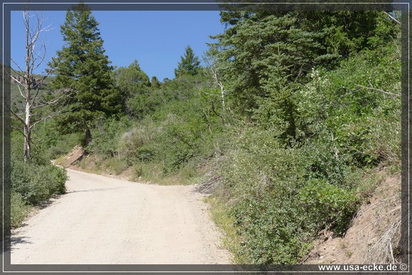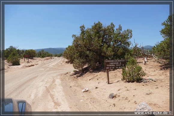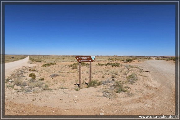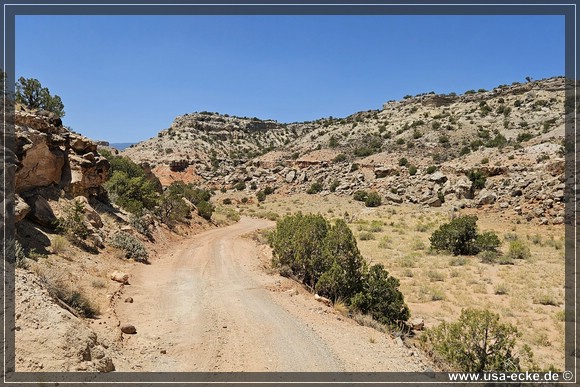Als wir die Spring Canyon Road erreichen, biegen wir nicht nach links ab, um zurueck zur UT 313 zu kommen, sondern folgen rechts der Schotterstrasse weiter. |