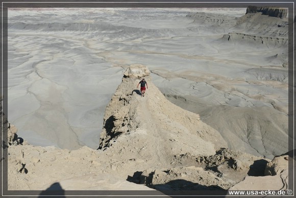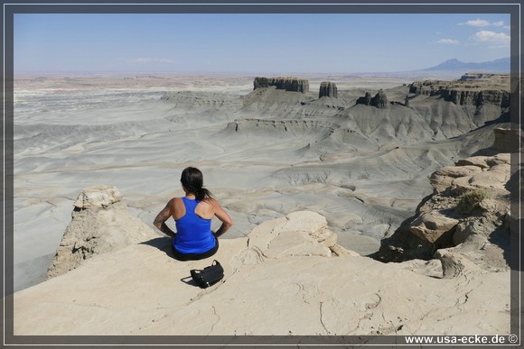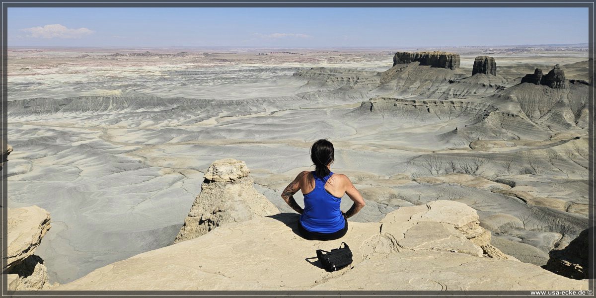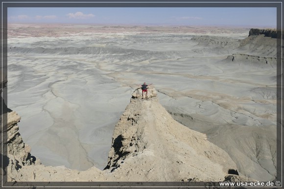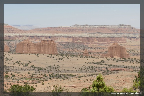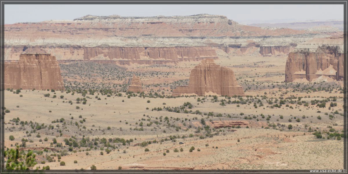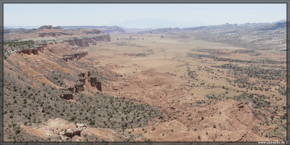 Allerdings gibt es ein kleines Stueck weiter den Lower Cathedral Valley Overlook mit einem tollen Blick hinunter ins Tal – doch dafuer haben wir - ja genau, richtig geraten - leider einfach zu wenig Zeit. |