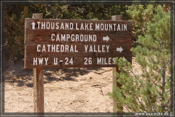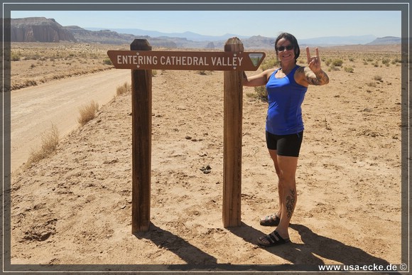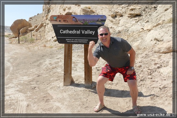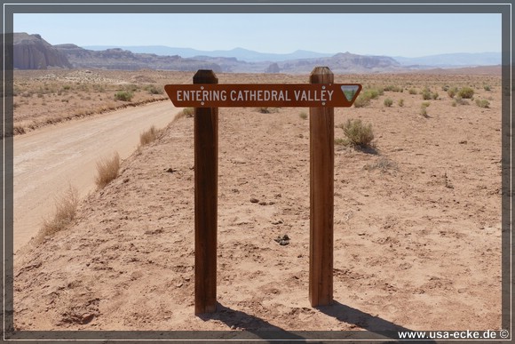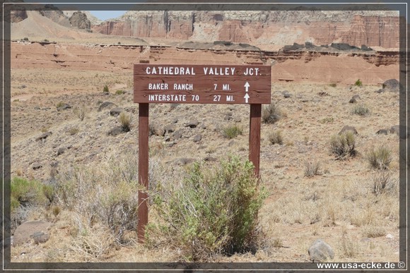 Auch auf dem Rueckweg schwimmen wir erneut durch die beiden Washes hindurch und sind froh, wieder zurueck auf der Cathedral Valley Road zu sein. Die letzten noch etwa 15,5 Meilen Back Road, die wir jetzt noch vor uns haben, liegen ausserhalb der Grenzen des Capitol Reef National Park. Als wir im Rueckspiegel das Hinweisschild zum Cathedral Valley sehen, muessen wir aber noch einen kurzen Foto-Stop einlegen.