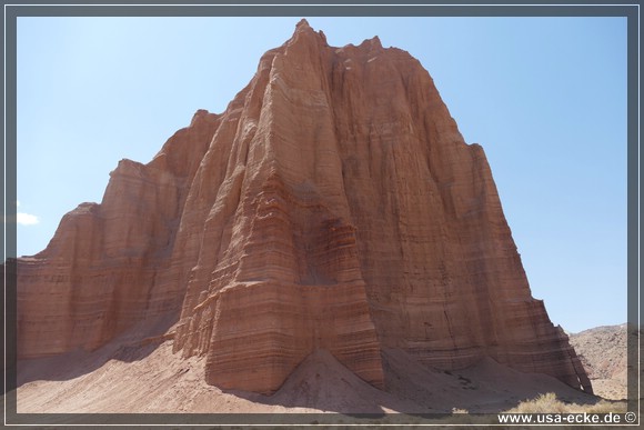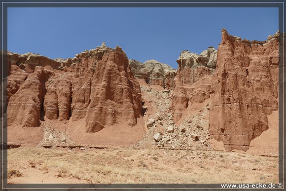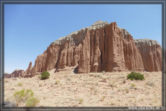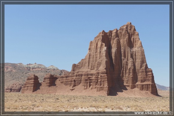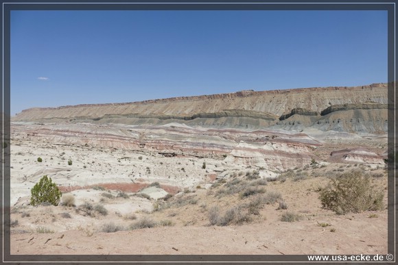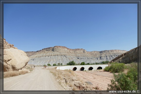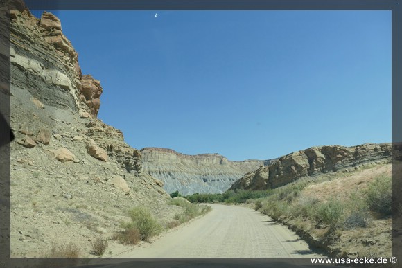 Nach insgesamt 16,5 Meilen bzw. 7,5 Meilen nach den Bentonite Hills erreicht man die Grenze zum Capitol Reef National Park. Der Tempel of the Moon ist Luftlinie von hier gerade mal zwei Kilometer entfernt, allerdings versperrt eine Bergkette den direkten Zugang und so hat man von hier so gut wie keine Chance, dort einfach mal hinzulaufen. |