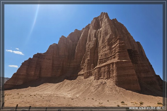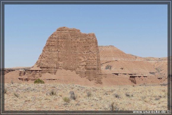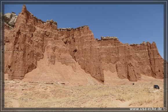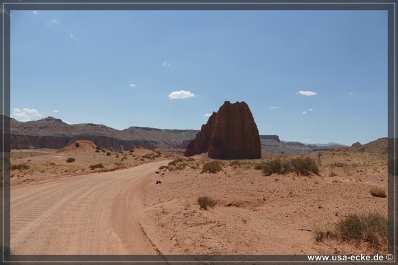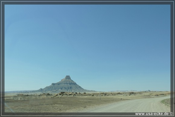 Die Factory Butte Road fuehrt zum riesigen und markanten gleichnamigen Tafelberg, den man sogar von der Cathedral Valley Loop Road aus sehen kann. So weit wollen wir allerdings gar nicht fahren, wir folgen der Schotter-Autobahn nur fuer gut sechs Meilen. |