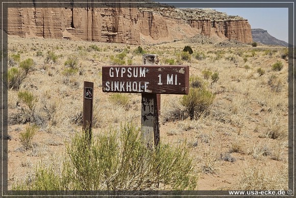 Kurz nach Cathedral Junction machen wir einen Abstecher zum Gypsum Sinkhole, das etwa eine Meile von hier entfernt ist. Vom Parkplatz sind es dann nur noch ein paar Meter Fussmarsch, bis man direkt vor diesem tiefen Loch im Boden direkt unterhalb einer massiven Felswand steht.