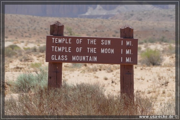 Die Haelfte der Strecke zwischen Cathedral Junction und der Abzweigung zu Temple of the sun and moon laeuft ausserhalb der Grenzen des National Parks, erst auf der etwas mehr als einer Meile langen Temple of the moon road ueberquert man wieder die Parkgrenze.