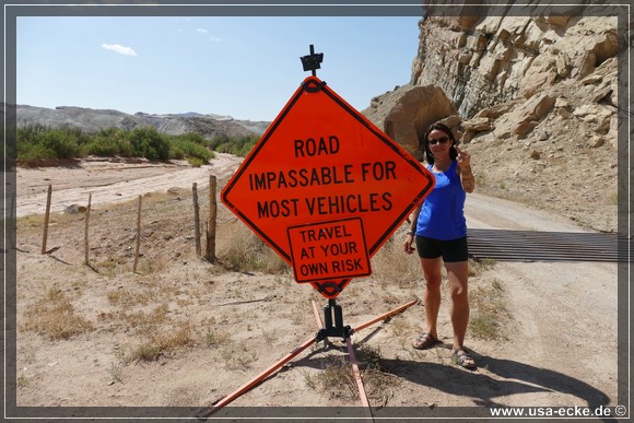 Natuerlich ist uns klar, dass die Fahrt ein gewisses Risiko darstellt, aber wir wollen es heute trotzdem wagen. Das Cathedral Valley steht schon lange auf unserer Bucket List und zu unserer Jubilaeums-Tour wollen wir uns diesen Traum nun endlich erfuellen.