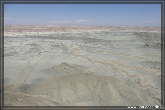 Unter uns liegt eine Mondlandschaft wie aus dem Bilderbuch. Die Landschaft ist so unwirklich, dass sie wirklich auf einem anderen Planeten sein koennte. Kein Wunder, dass sich die beruehmte Marsstation irgendwo unter uns in der Naehe dieses Gelaendes befindet. |