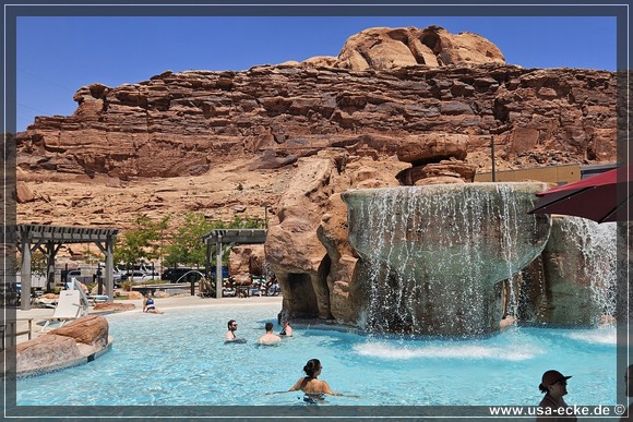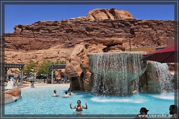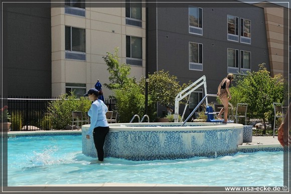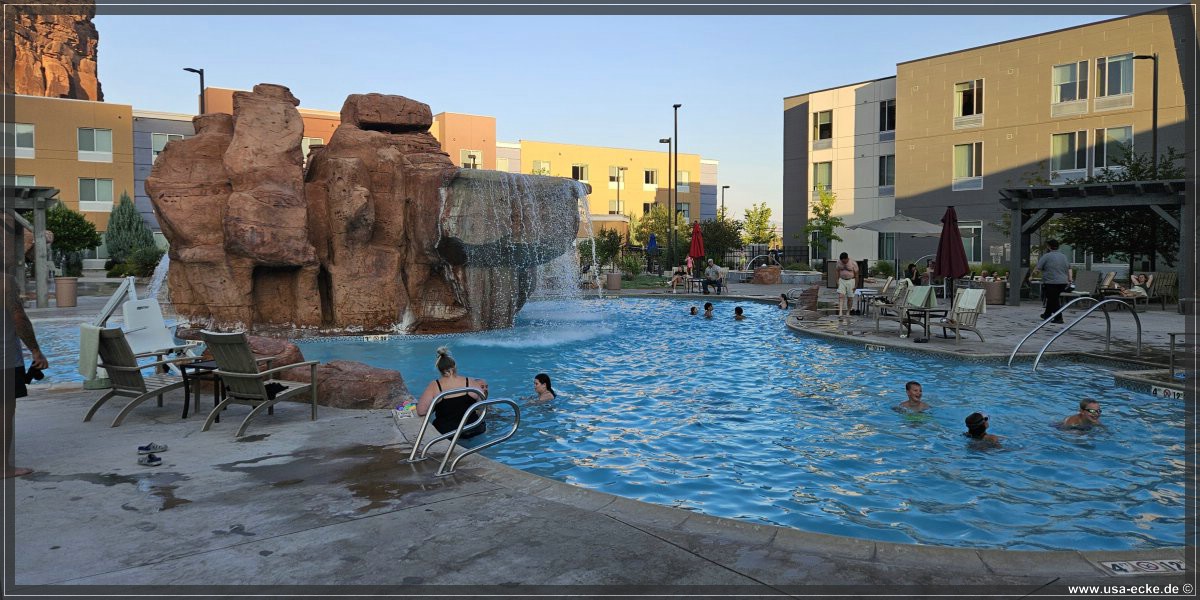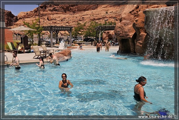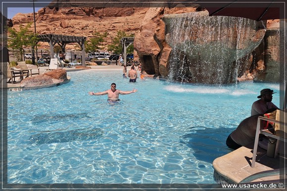 Mittags gibt es bei Subway nahe der Moab Brewery wieder ein "Footlong", dann geht es zurueck zum Hotel. Wir brauchen eine Abkuehlung und springen deswegen erst einmal in den Pool. |