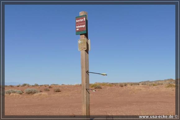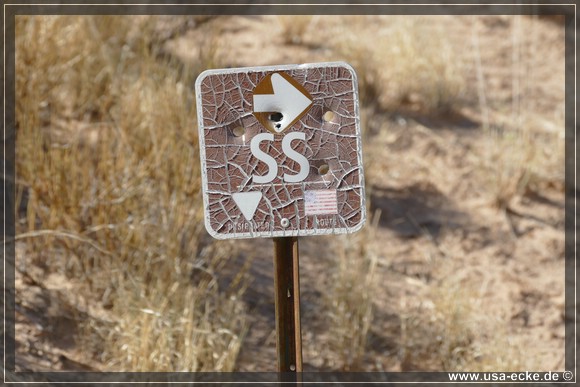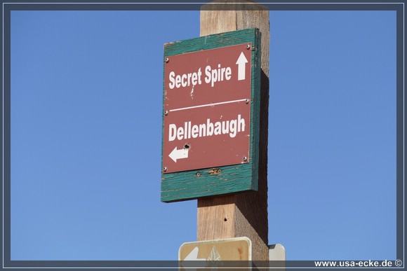 Wir packen ein paar Flaschen Wasser in unseren Kuehlucksack und machen uns auf den Weg in Richtung Secret Spire. Von unserem Parkplatz bis zu dieser markanten Felsnadel muessen wir etwa eine halbe Meile laufen. An zwei Abzweigungen findet man ebenfalls wieder je ein SS-Hinweisschild und wenn man diesen Schildern folgt, kann man die Secret Spire nicht verfehlen. |
