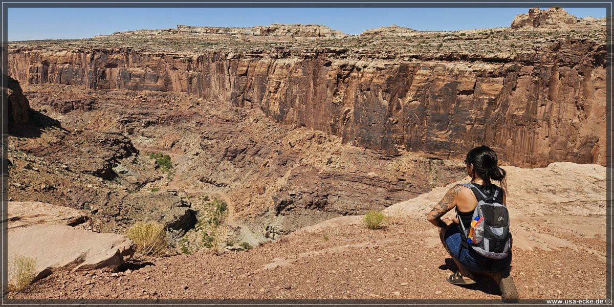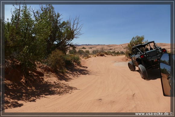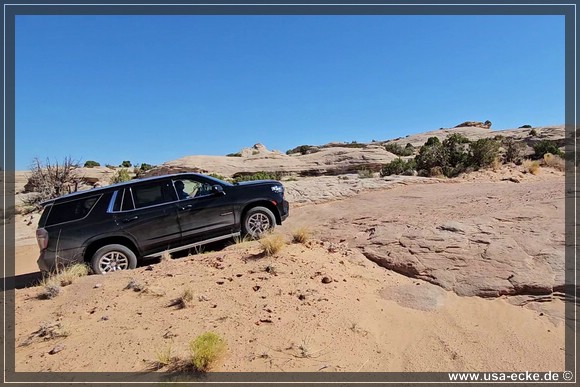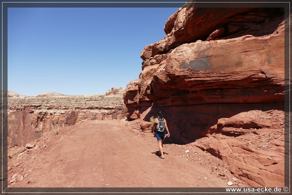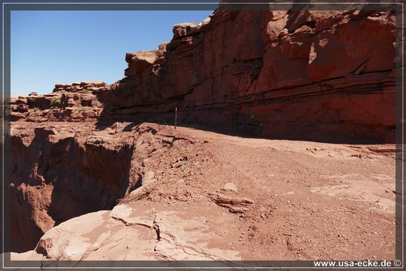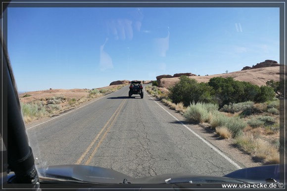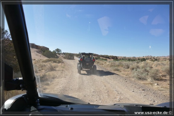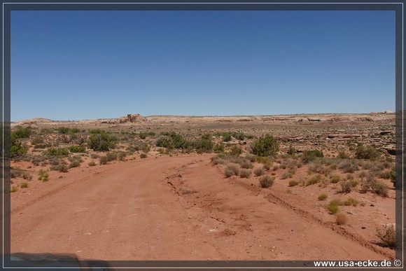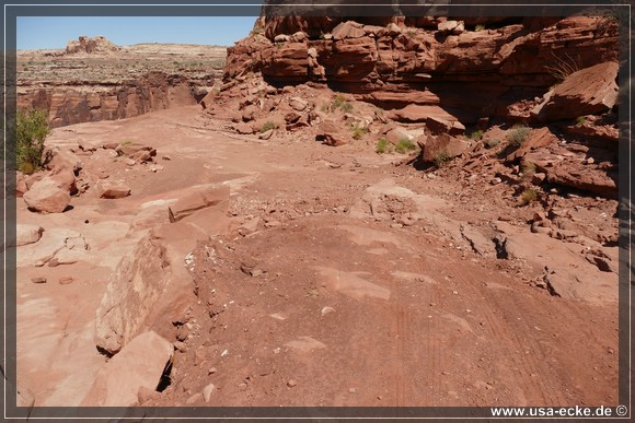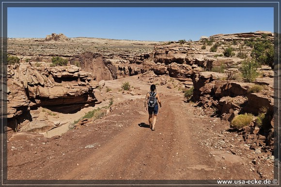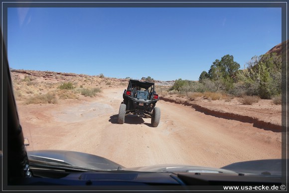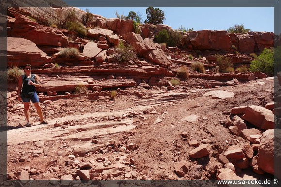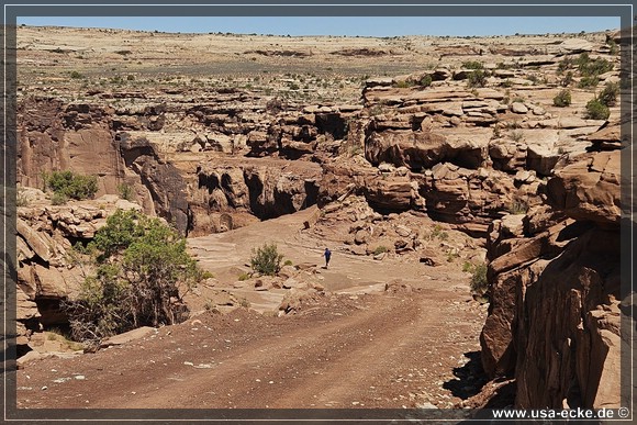 Irgendwann machen wir kehrt, laufen zum Auto und fahren zurueck nach Moab. Aber - Spring Canyon Buttom bleibt auf unserer Bucket List. Vielleicht klappt es ja doch noch, man muesste nur mal wieder einen Jeep ausleihen... |