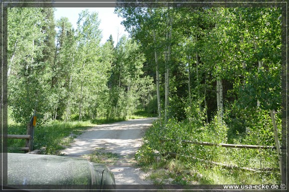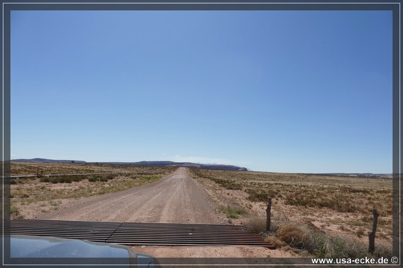 Auf dieser zeitweise doch relativ schlechten Back Road bleibt man nun fuer weitere zwei Meilen, bis man wieder ein Cattle Guard erreicht. Zwischendurch zweigen rechts mal Wege ab, die man getrost ignorieren kann. Am besten immer links halten. |