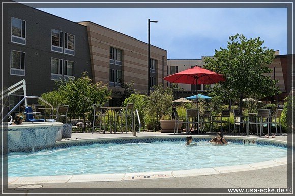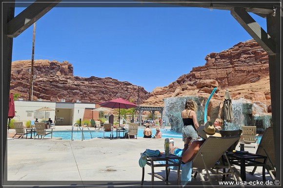 Deutlich frueher als erwartet sind wir nun zurueck am Hotel und springen nach einer kleinen Brotzeit erstmal in den Pool. Der grosse mit dem Wasserfall ist uns fast schon zu kalt, aber es gibt ja noch einen zweiten und der ist deutlich waermer. Und Hot Tubs gibt es auch noch ein paar... |