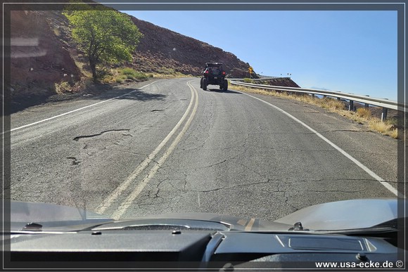 Heute sind nur drei Fahrzeuge hinter ihm und alle haben sofort einen guten Eindruck hinterlassen, sodass er uns auf die krasse Runde fuehren kann. Und die hat es wirklich in sich, macht aber dafuer auch wahnsinnig Laune. Und der Colorado River Overlook hier ist sowieso der Oberhammer! |