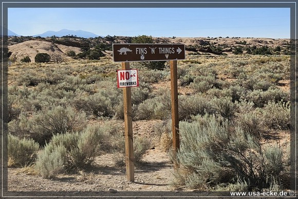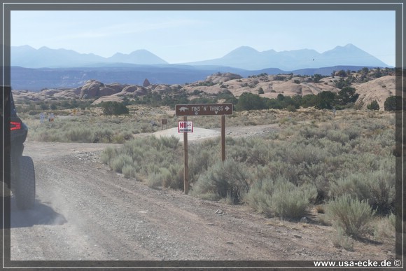 Die dreieinhalb Stunden lange Tour beginnt um neun und nach einer kurzen Einweisung starten wir puenktlich von Moab in Richtung Sand Flats Recreation Area. Zuerst geht es zu Fins 'N' Things, das etwa 1,7 Meilen nach der Entrance Station rechts von der Gravel Road abzweigt. |