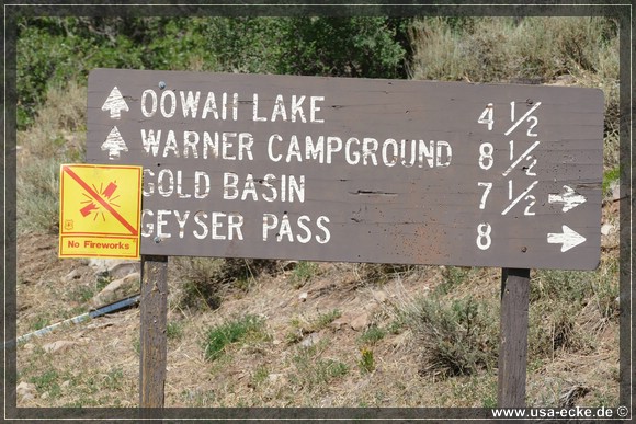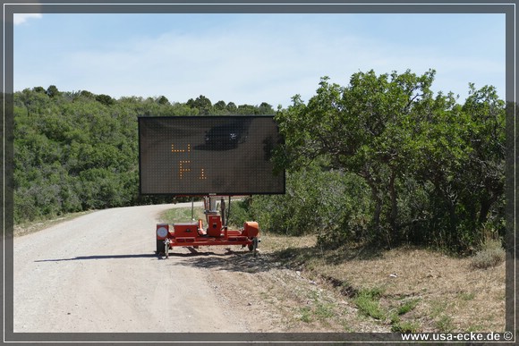 Als wir die Abzweigung zum Geyser Pass erreichen, sind wir sehr enttaeuscht. Vor uns steht eine fahrbare Hinweistafel, auf der in grossen Leuchtbuchstaben die Vollsperrung der Back Road angezeigt wird. Oben in den Bergen wuetet wohl aktuell ein groesserer Waldbrand und fuer Besucher waere es aktuell wohl einfach zu gefaehrlich. |