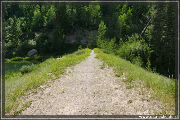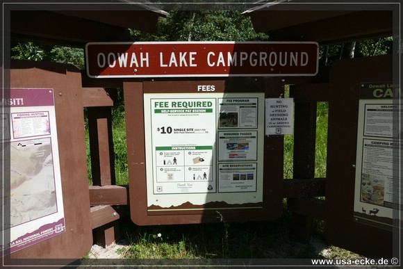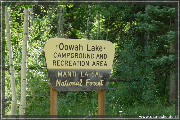 Zum Glueck haben wir immer einen Plan B in der Tasche, sodass wir jetzt zumindest nicht gleich wieder umdrehen muessen. Wir fahren ein paar Meilen weiter, bis rechts die Strasse zum Oowah Lake abzweigt. Ueber eine drei Meilen lange Gravel Road geht es bis zur Recreation Area und dem Campground direkt an dem kleinen Stausee. |