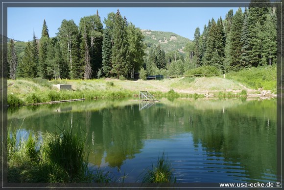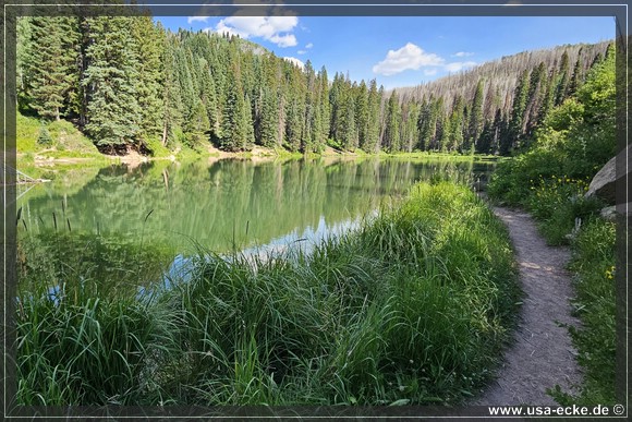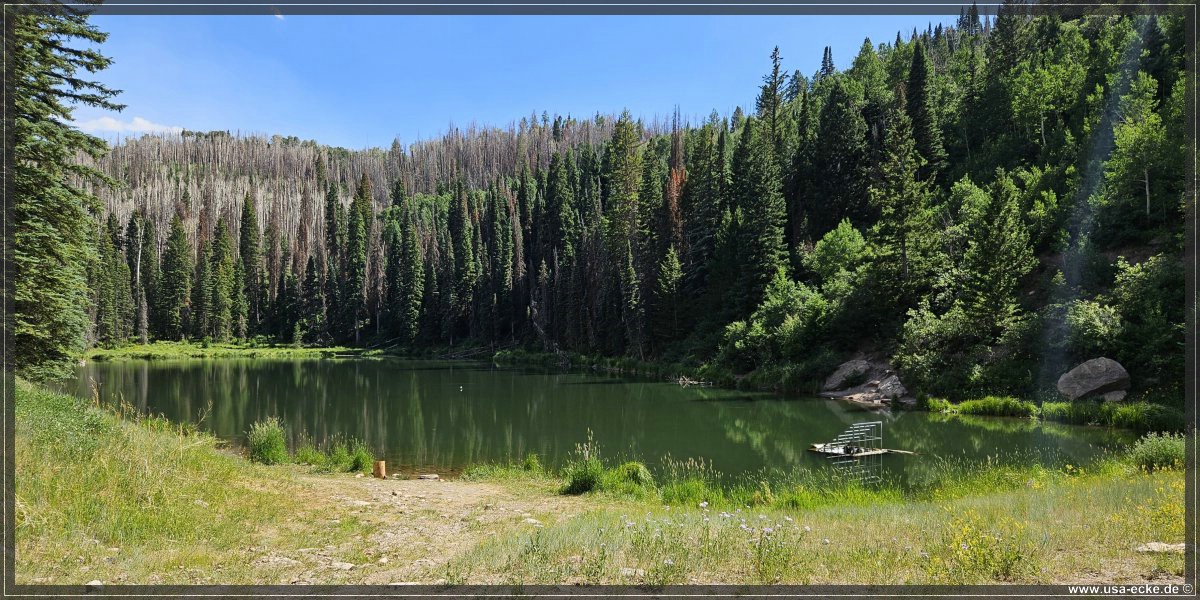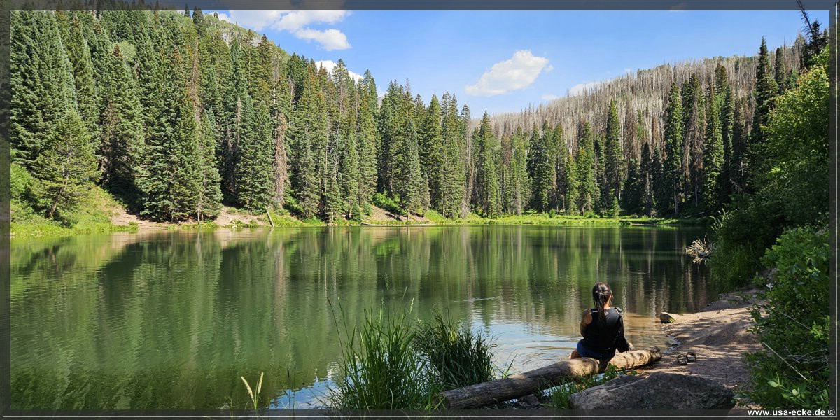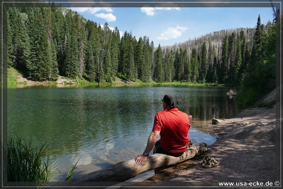 Ist das schoen hier! Vor uns liegt ein idyllischer See wie aus dem Bilderbuch. Das haetten wir so nah an Moab nie erwartet. Voll klasse. Wir spazieren ein wenig am See entlang, halten die Fuesse ins Wasser und geniessen die deutlich kuehleren Temperaturen hier oben. |