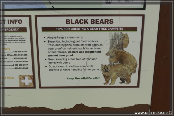 Auf den Hinweis Tafeln am Parkplatz wird hingewiesen, dass es hier Baeren gibt und wie man sich verhalten sollte, damit man auf diesem Campground auch sicher campen kann. Was, hier gibt es tatsaechlich Schwarzbaeren? |