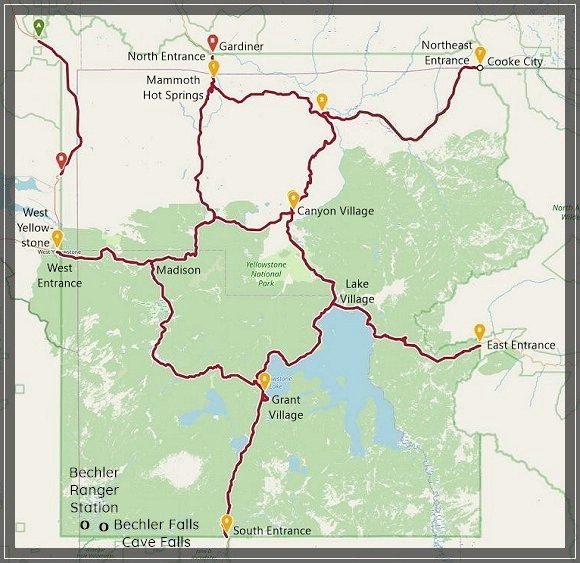 Das letzte Stueck Strecke ist ausserdem nicht mehr geteert, die Gravel Roads zur Ranger Station und den Wasserfaellen sind in der Regel jedoch gut befahrbar. Von der Stelle, an der der Teer endet, bis zur Abzweigung der Bechler Station Road sind es 10,7 Meilen Gravel Road. Von hier muss man weitere 1,5 Meilen bis zur Bechler Ranger Station beziehungsweise 2,9 Meilen bis zum Parkplatz an den Cave Falls fahren.