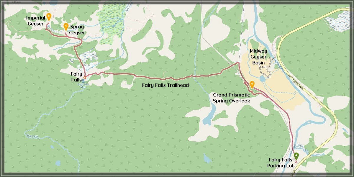 Alles in allem ist der Fairy Falls Trailhead mit seinen insgesamt 10,5 Kilometer Laenge (Roundtrip) ein sehr lohnenswerter und wunderschoener Hike, bei dem man neben dem Wasserfall auch noch tolle Geysire und Pools zu sehen bekommt und gleichzeitig den Touristenmassen entfliehen kann. Und den Grand Prismatic Spring von oben zu sehen, ist sowieso grandios... |