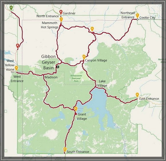 Die Highlights aber liegen auf der Acht. Insbesondere der Bereich zwischen Grant Village und Madison ist voll von Geysirbecken. Mit Ausnahme der Mud Volcano Area befinden sich alle Geyser Basins auf der westlichen Spange der Acht, also zwischen Grant Village und Mammoth Hot Springs.