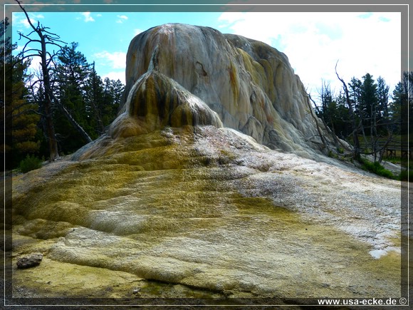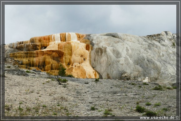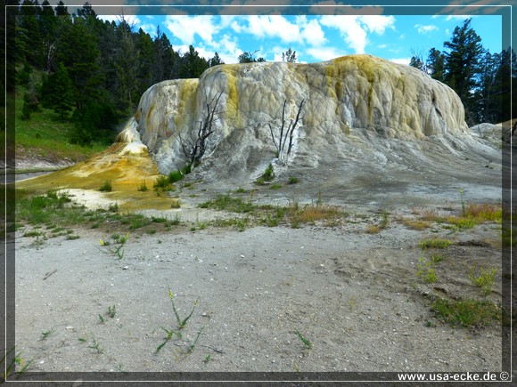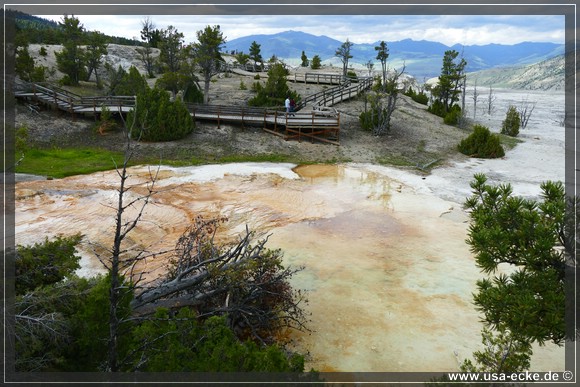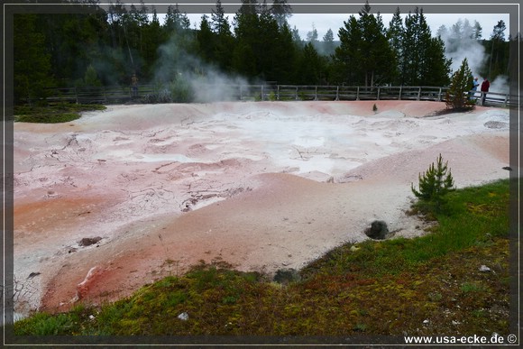 Terrace Spring: Dieses kleine Themalgebiet grenzt direkt an das Gibbon Geyser Basin, gilt jedoch tatsaechlich als eigenstaendig. Es befindet sich nahe Madison Junction auf der Grand Loop Road in Richtung Norris Junction. Fuer den kurzen Weg zur Terrace Spring braucht man nur wenige Minuten und viel mehr gibt es hier tatsaechlich auch gar nicht zu sehen. Da die Thermalquelle aber direkt an der Strasse liegt und fuer einen Besuch vielleicht 15 Minuten eingeplant werden muessen, sollte man diesen Punkt ruhig mitnehmen.
