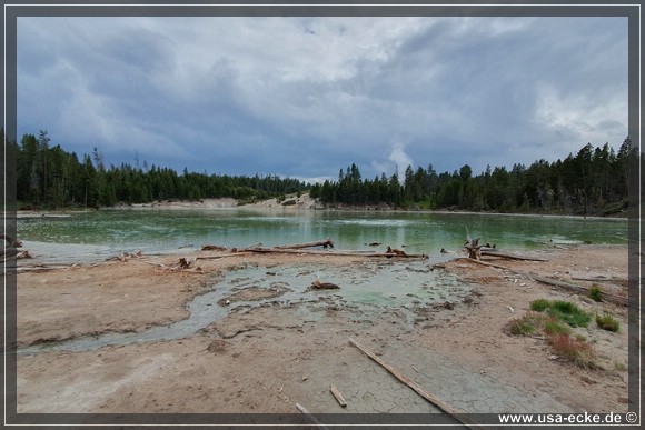 Nur einen Steinwurf weiter auf der anderen Strassenseite am Yellowstone River liegt Sulphur Caldron. Uebersetzt bedeutet das soviel wie Schwefelkessel und dieser ist tatsaechlich fast so sauer wie Batteriesaeure.