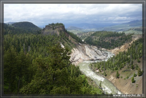 Bleibt man auf der Westseite des Flusses auf der Grand Loop Road, ist nicht weit suedlich von Tower Junction der Calcite Springs Overlook. Die Aussicht hinunter auf Calcite Springs und den Yellowstone River ist atemberaubend.