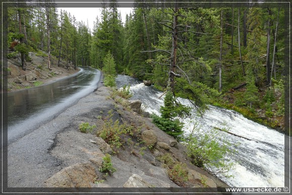 Firehole Canyon Drive: Die zwei Meilen lange Einbahnstrasse bei Madison Junction fuehrt durch den wunderschoenen Firehole Canyon, immer am Firehole River entlang. Auf halber Strecke befinden sich die schoenen Firehole Falls, am Ende kurz vor der Kreuzung mit der Grand Loop Road gibt es auch noch eine Firehole River Swimming Area. |