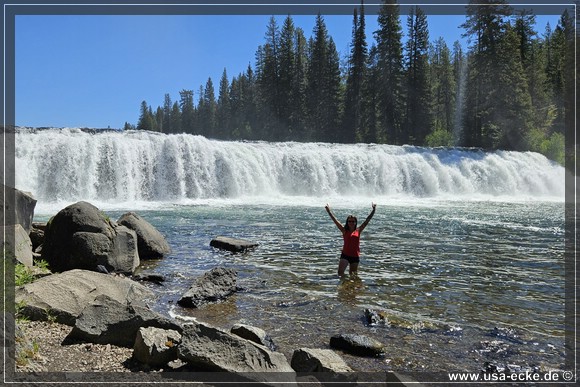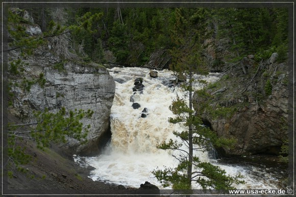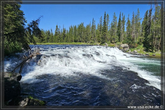 Kepler Cascades: Nur etwa 2,5 Meilen vom Upper Geyser Basin entfernt in Richtung West Thumb befindet sich der Wasserfall direkt der Grand Loop Road. Der Firehole River stuerzt hier ueber mehrere Stufen etwa 45 Meter in die Tiefe. Der hoechste Drop ist etwa 15 Meter hoch.