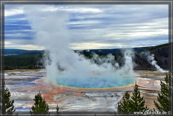 Nur das letzte Stueck geht etwas bergauf, ist aber nicht sonderlich anstrengend. Oben angekommen hat man einen Wahnsinnsblick auf das Midway Geyser Basin, insbesondere auf Grand Prismatic Spring. |